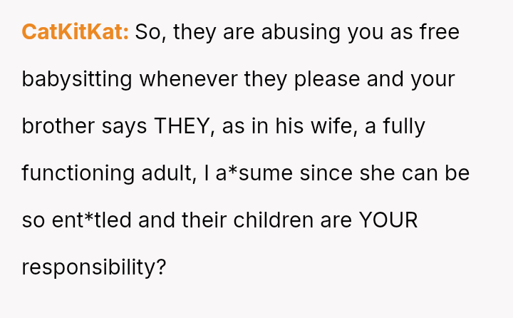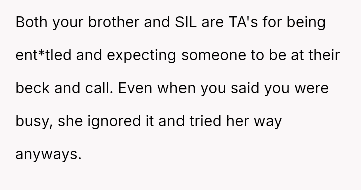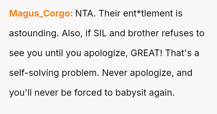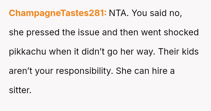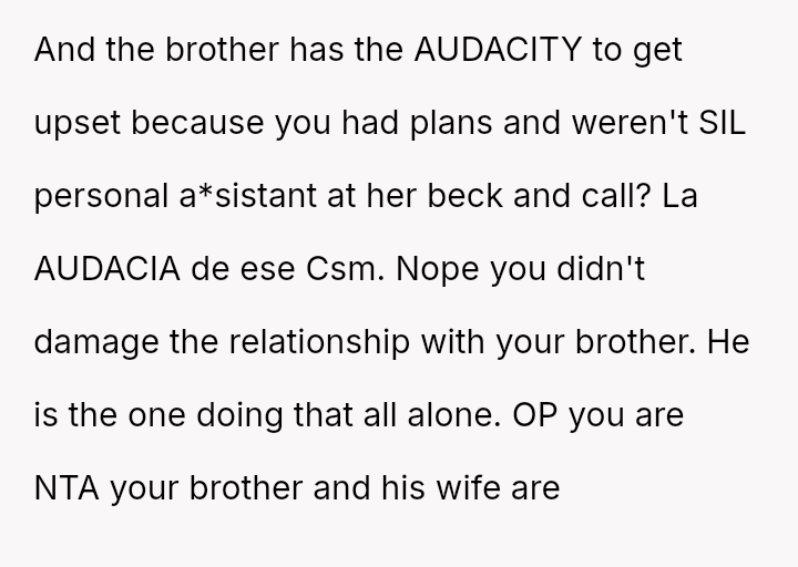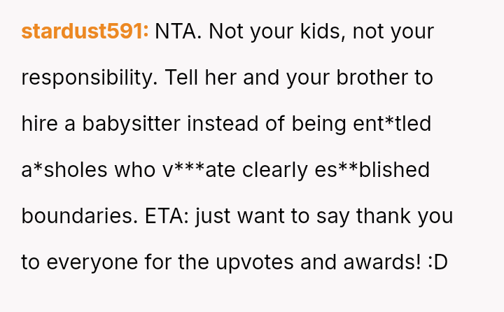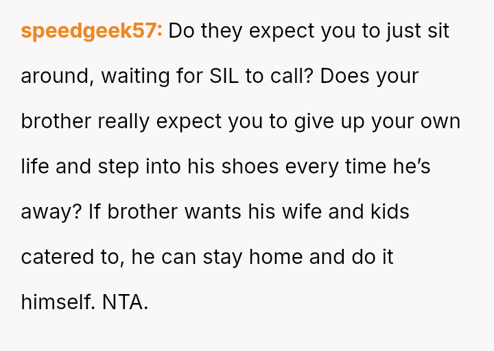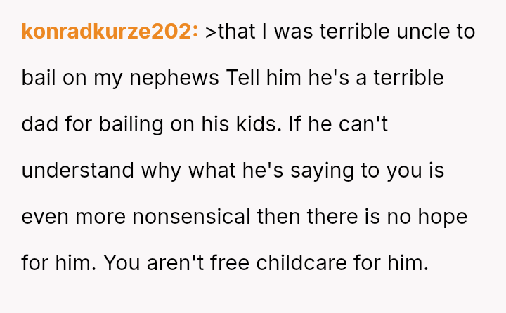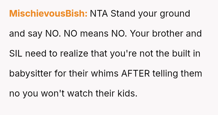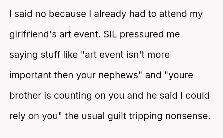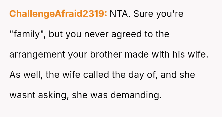 The original poster faced a significant conflict between his personal commitments and the perceived obligations placed upon him by his brother regarding childcare.