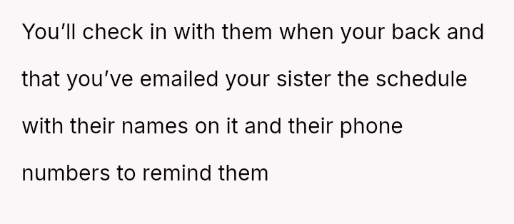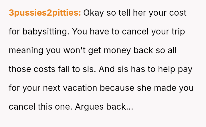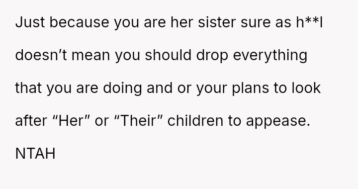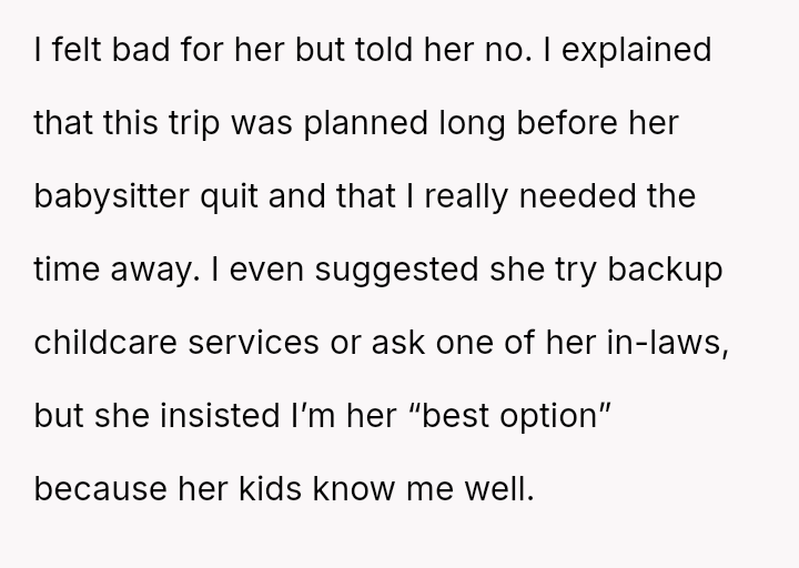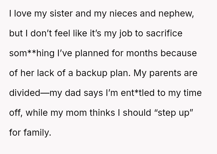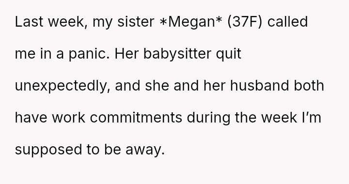 The original poster (OP) is facing a conflict between their deeply needed personal time, planned months in advance, and their sister's urgent, last-minute childcare crisis.