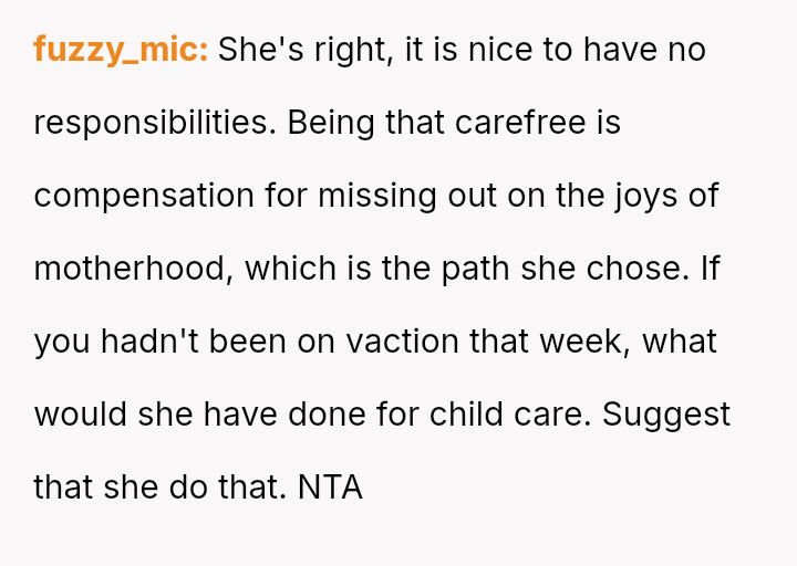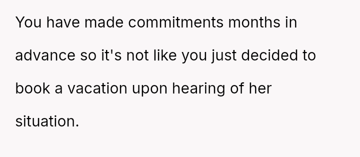 Is the OP justified in upholding their planned solo vacation despite their sister's emergency, or does the immediate, critical need of family, especially children, create an obligation that supersedes personal leisure time? Where should the line be drawn between individual self-care and familial responsibility?