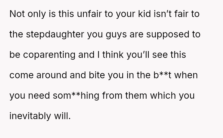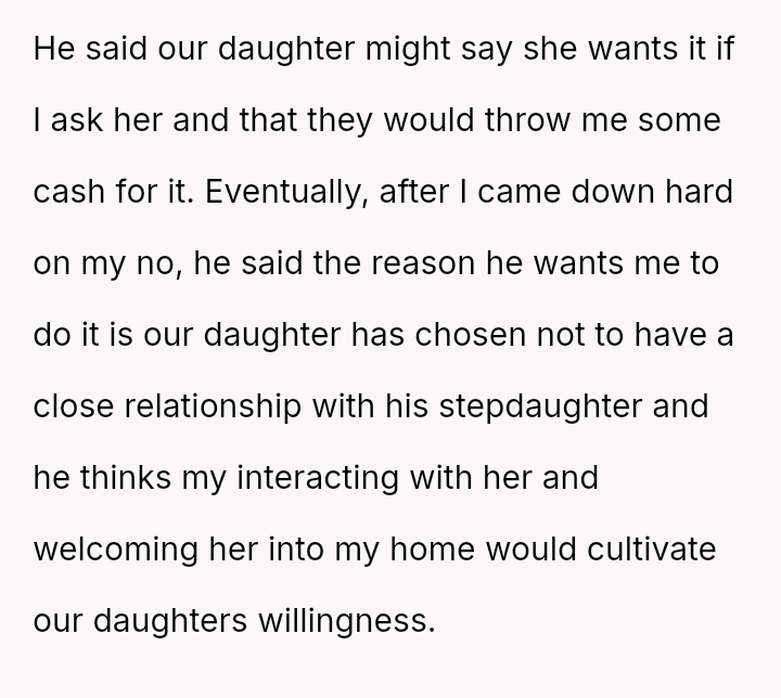 The central conflict stems from the ex-husband's expectation that the OP should actively participate in managing his blended family obligations, which conflicts directly with the OP's es**blished position that she is not responsible for cultivating her daughter's relationship with the stepdaughter.
