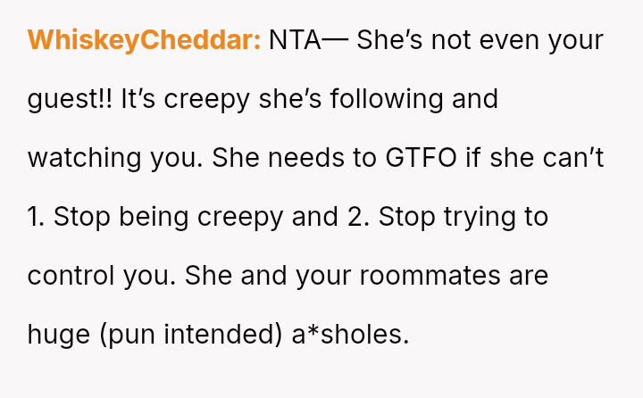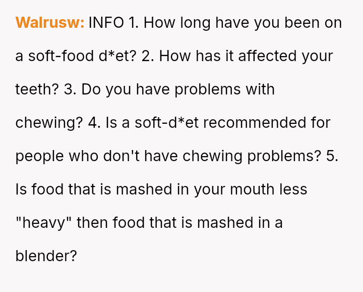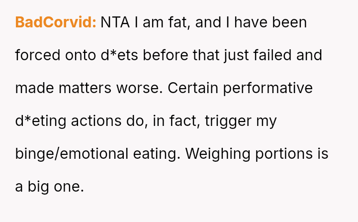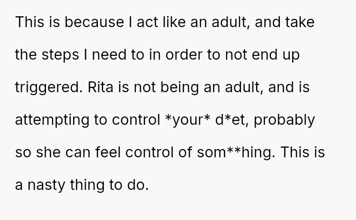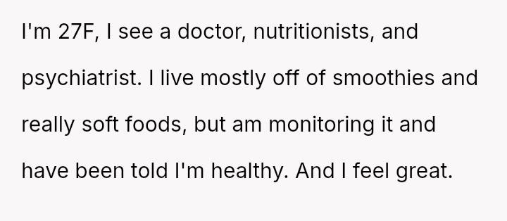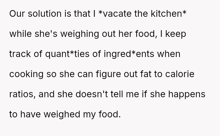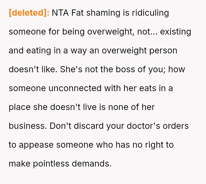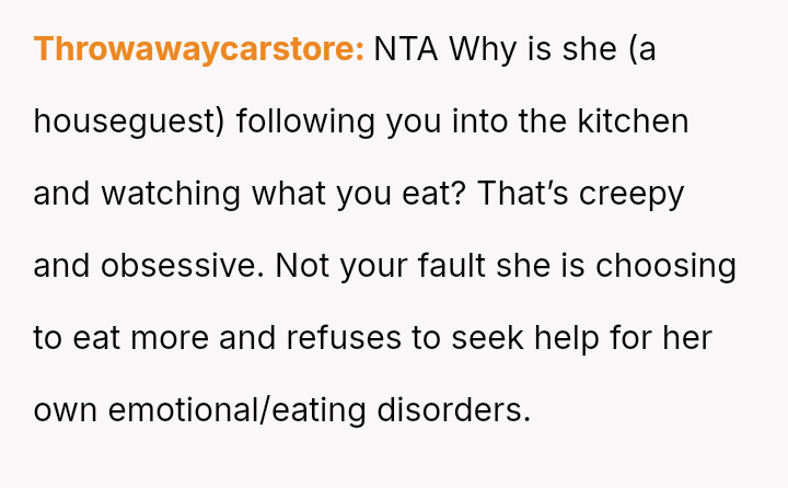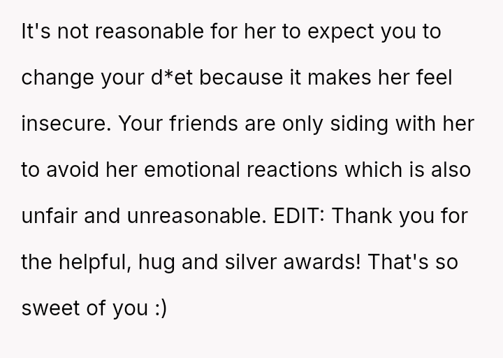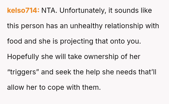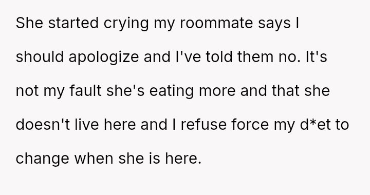 The original poster (OP) is facing a conflict where their es**blished, medically supervised d*etary choices are being challenged by their roommate's partner, who claims the OP's eating habits trigger her own emotional eating issues.