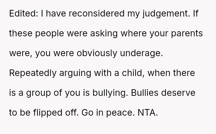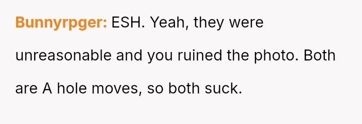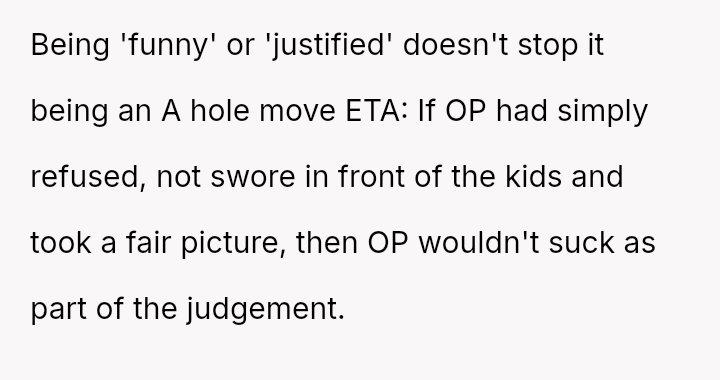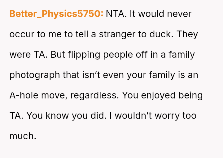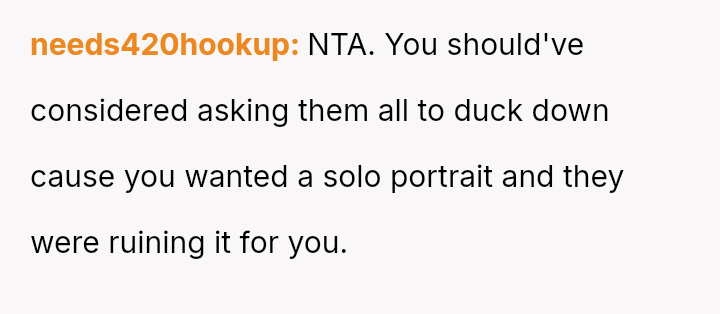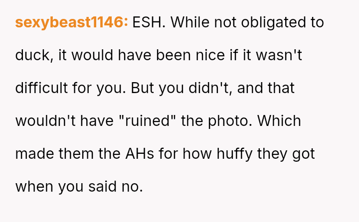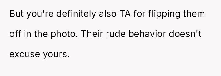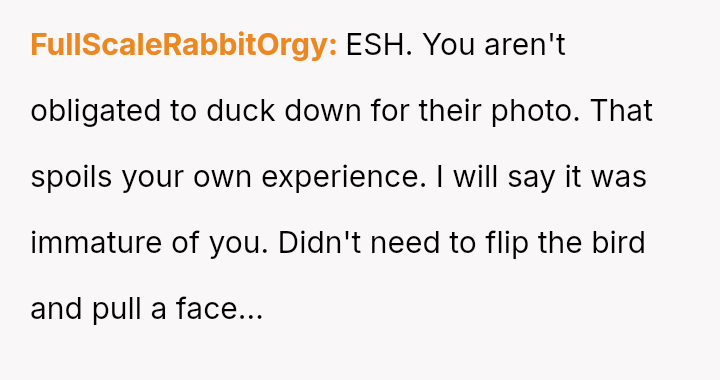 Was the OP justified in prioritizing their personal boundary against an unso***ited request, even if it resulted in ruining another group's intended photograph, or did the level of confrontation—especially flipping off the camera—cross the line into unreasonable immaturity?