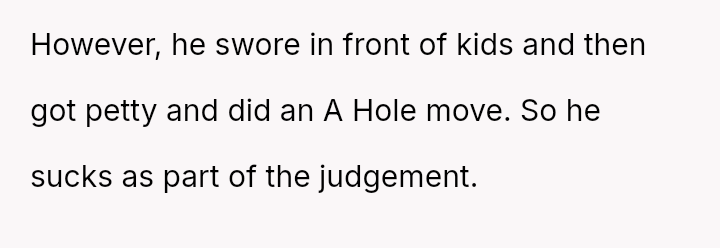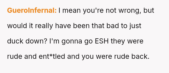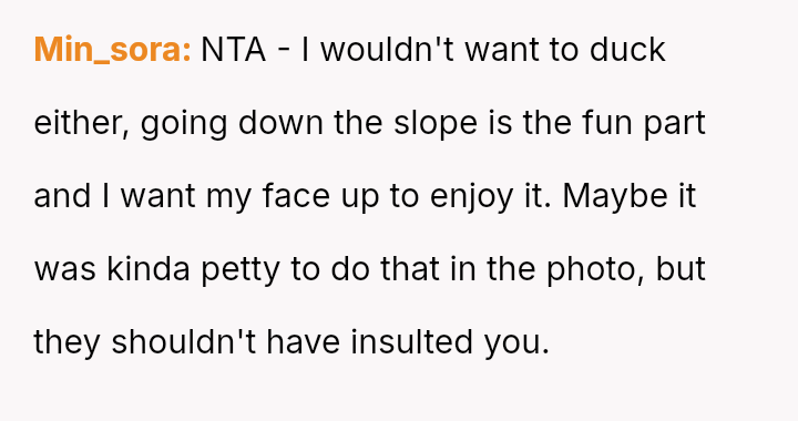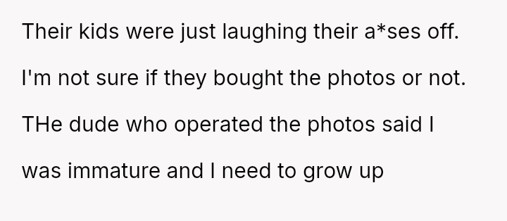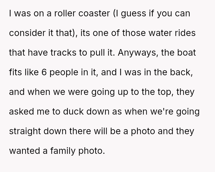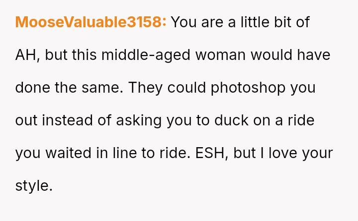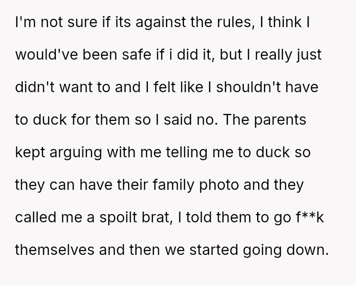 The original poster (OP) firmly rejected a request from a family to duck down for a ride photograph, leading to an escalation where the family insulted the OP, and the OP responded with defiance and antagonistic gestures toward the camera.