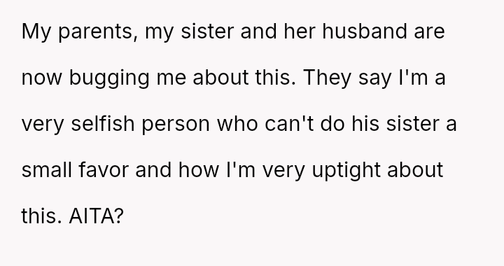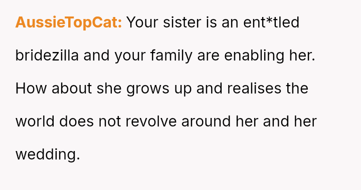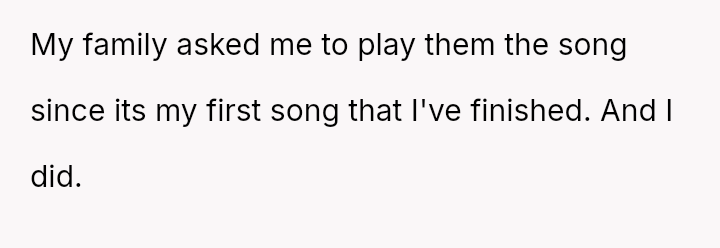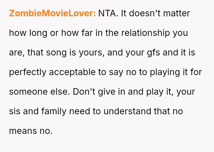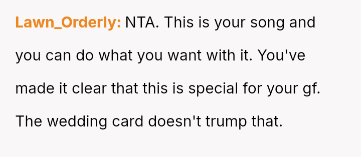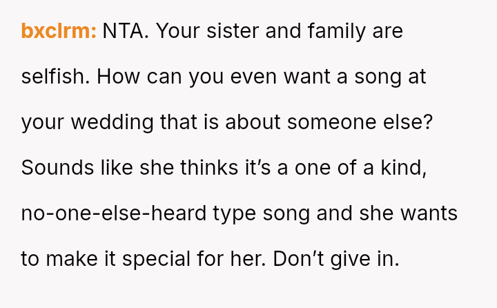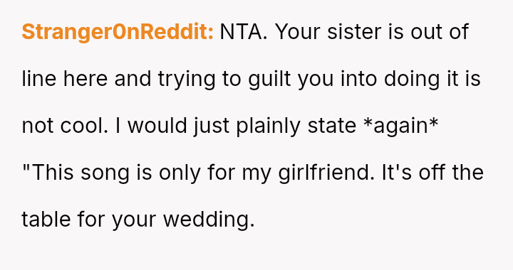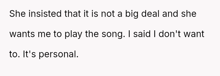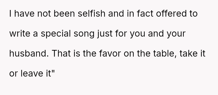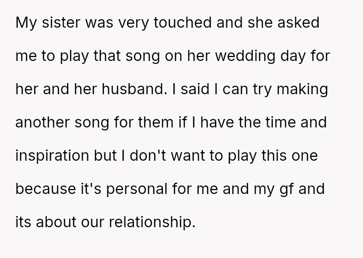 The central conflict lies in the OP's firm boundary protecting a meaningful creation tied to their relationship versus the family's insistence that sibling obligation and the importance of the wedding supersede the song's personal significance.