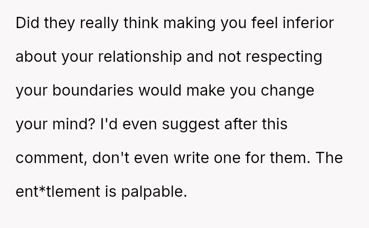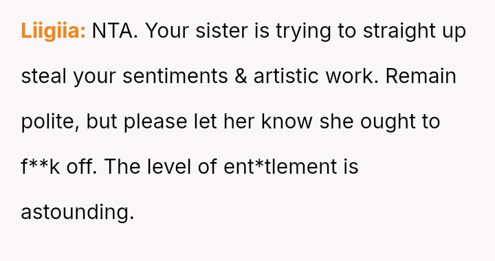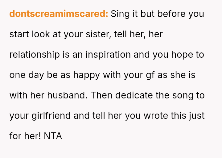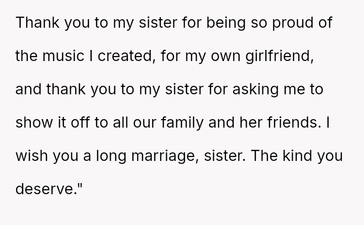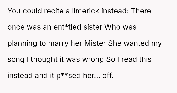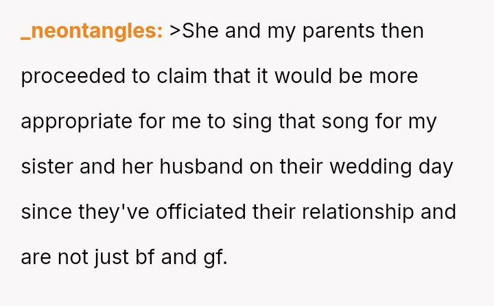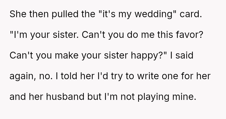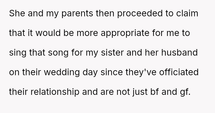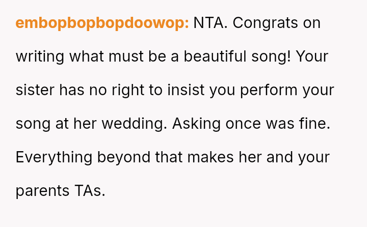 Given the family's pressure and accusations of selfishness, is the OP correct in prioritizing the protection of their intimate creative work and relationship narrative over their sister's specific request for the wedding performance, or does the familial context demand a sacrifice of personal comfort for a major life event?