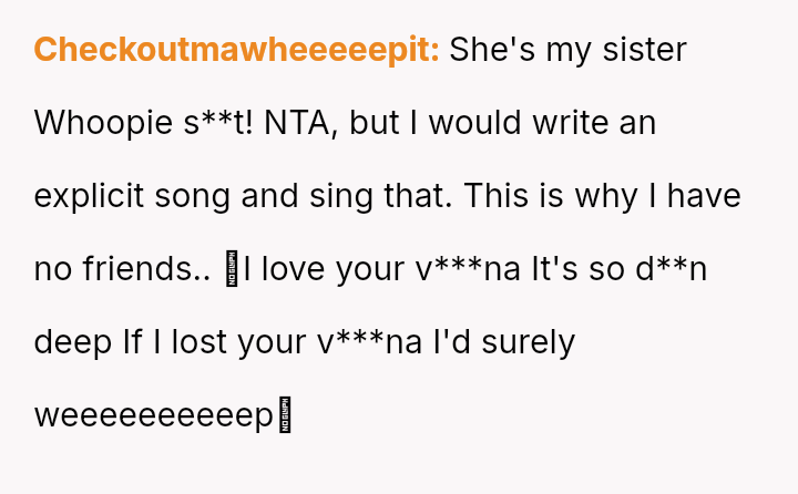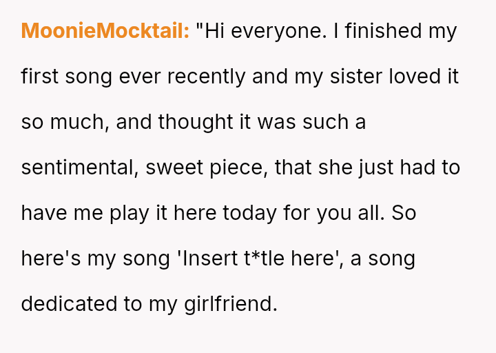 The original poster (OP) is experiencing significant emotional distress because their deeply personal song, written for their long-term girlfriend, is being demanded for use at their sister's wedding by the sister and parents.