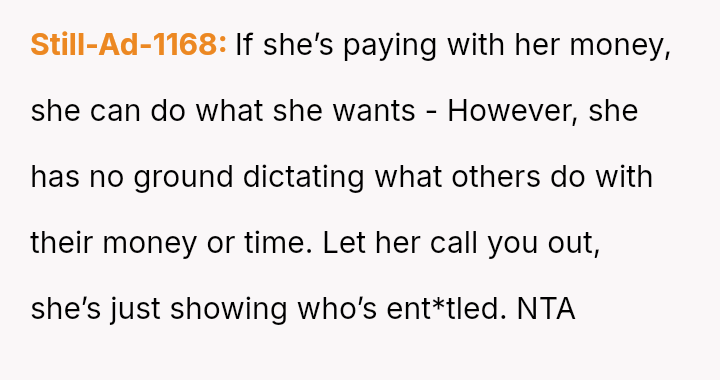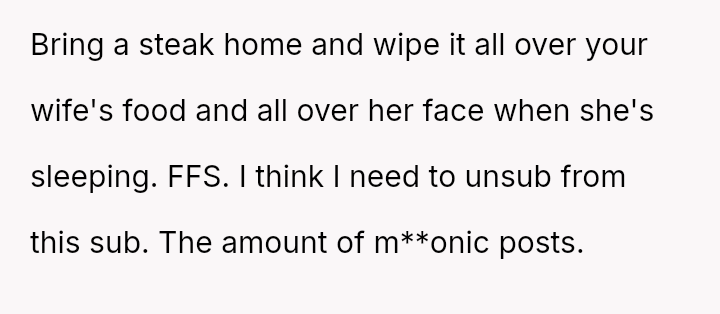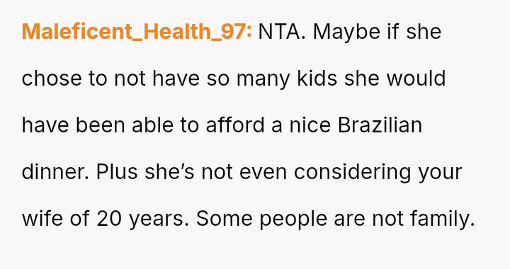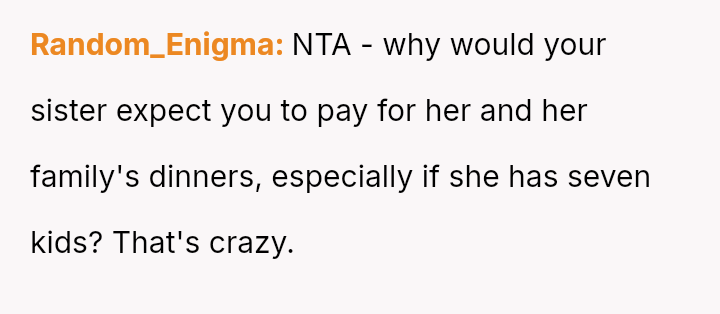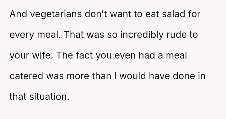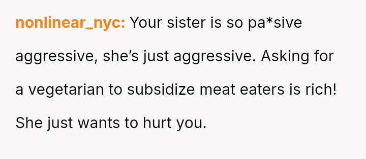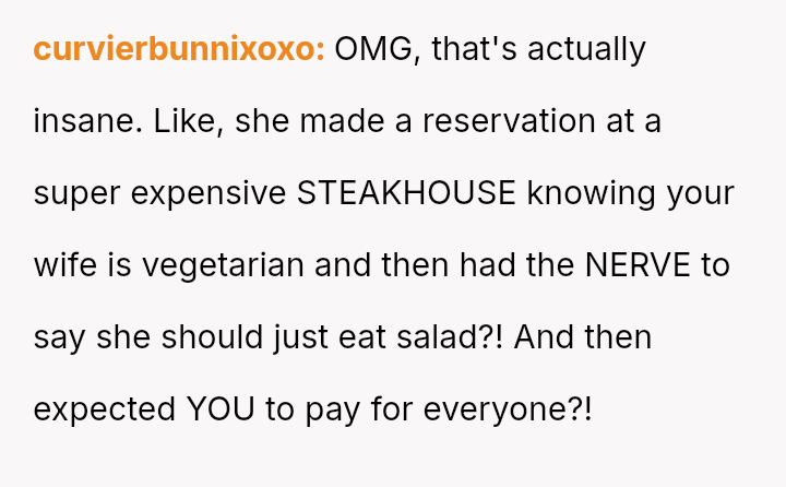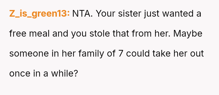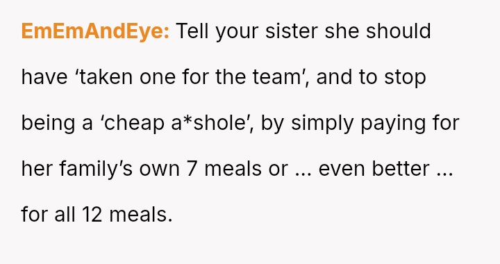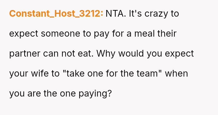 The sister dismissed this concern, suggesting the wife should just eat a salad to 'take one for the team' and save the OP a small amount.