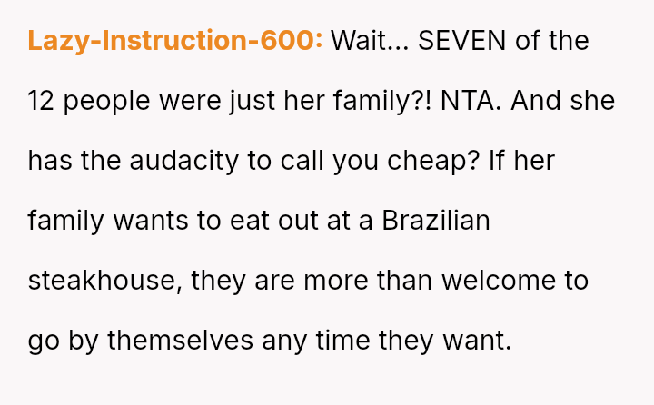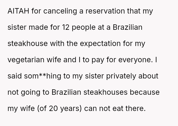 The original poster (OP) recounted a situation involving a reservation made by their sister for a large group dinner at a Brazilian steakhouse for twelve people.