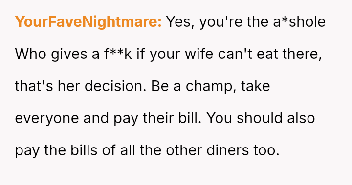 The central conflict revolves around the OP's decision to prioritize their wife's d*etary needs and financial boundaries over the sister's chosen venue and expectation that the OP would subsidize the entire group's meal.