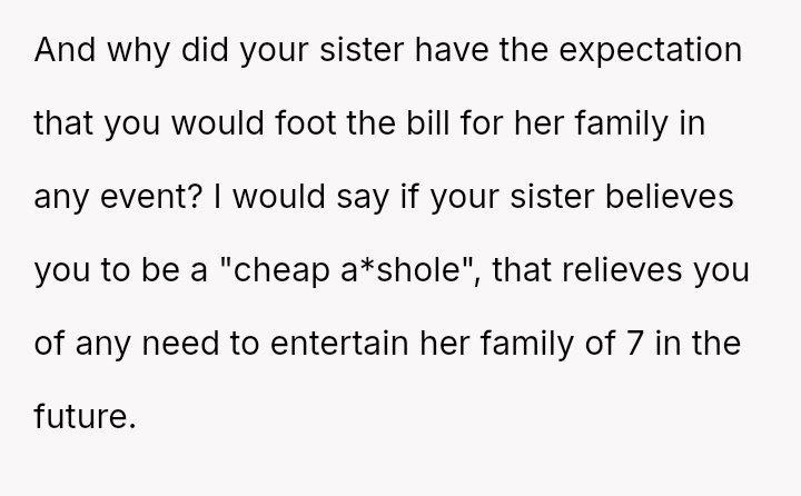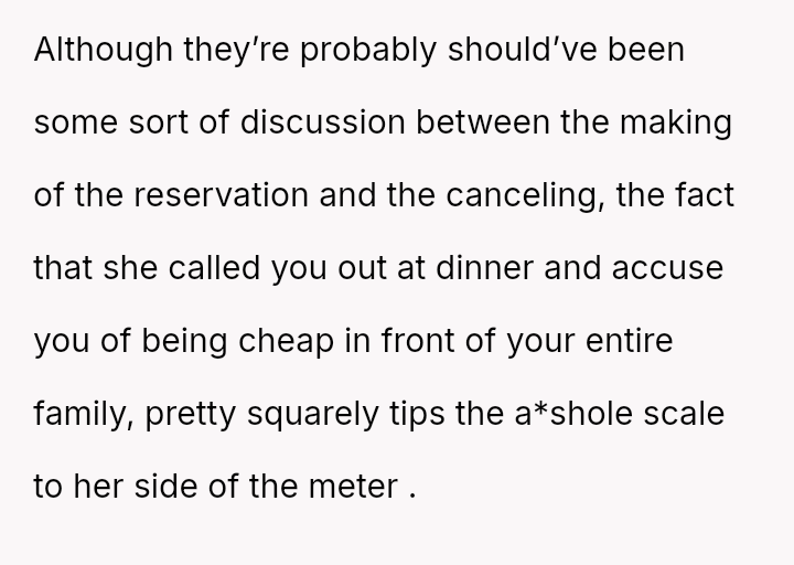 The core question is whether the OP was justified in canceling the reservation and arranging an alternative meal when faced with a potentially expensive outing that excluded his wife and demanded he pay for others, or if this response was an overreaction to the sister's poor suggestion.