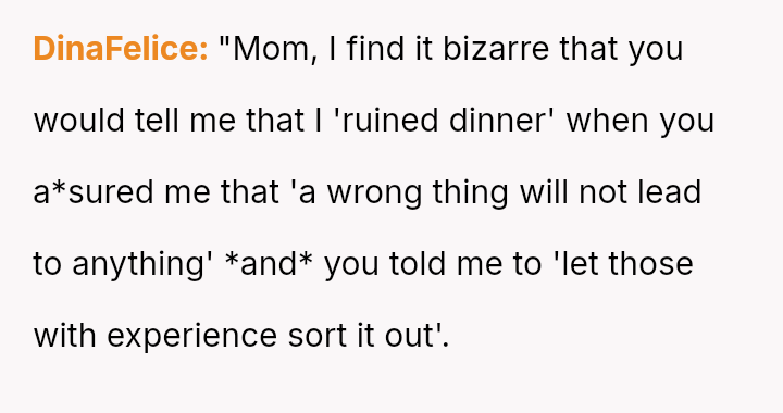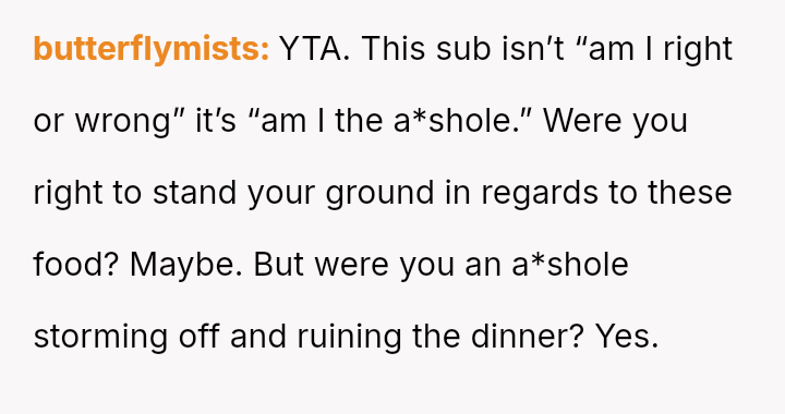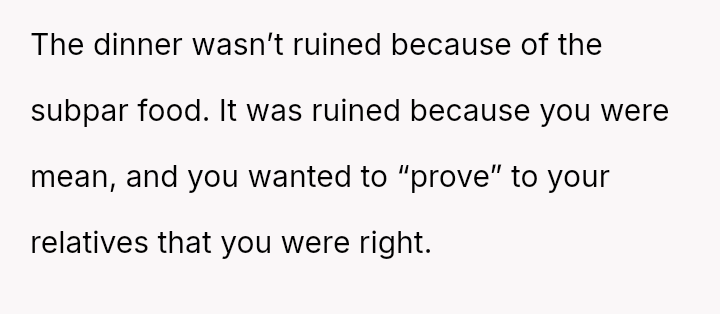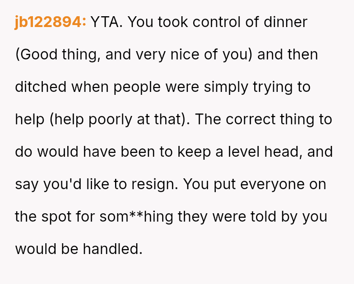 Conflict arose when family members, including the OP's mother, disregarded the OP's es**blished, precise organizational process, leading to significant cooking errors and ultimately, a ruined dinner.