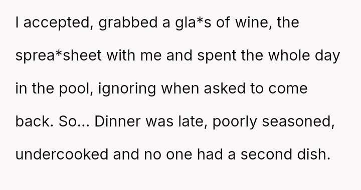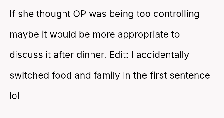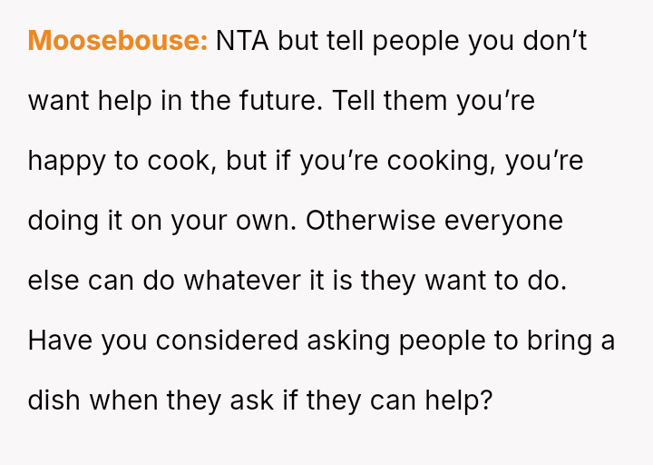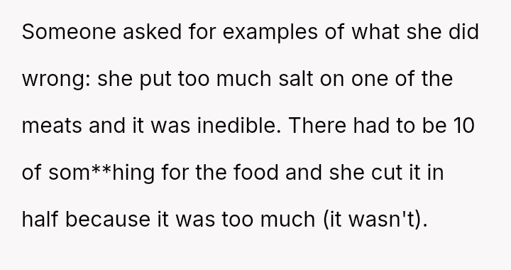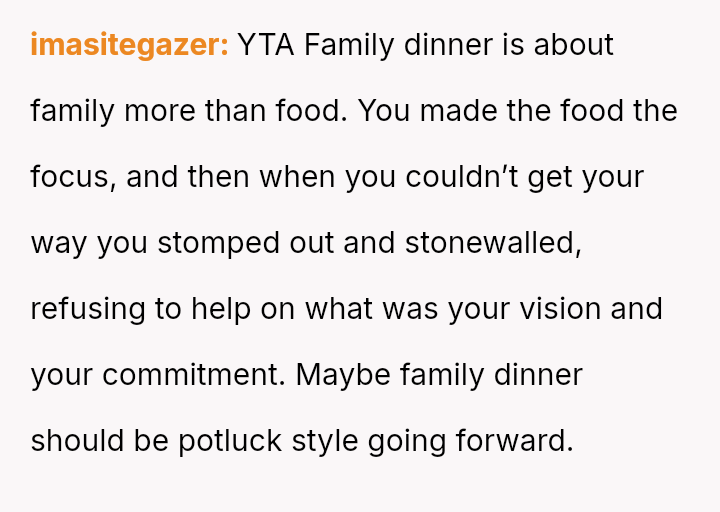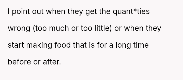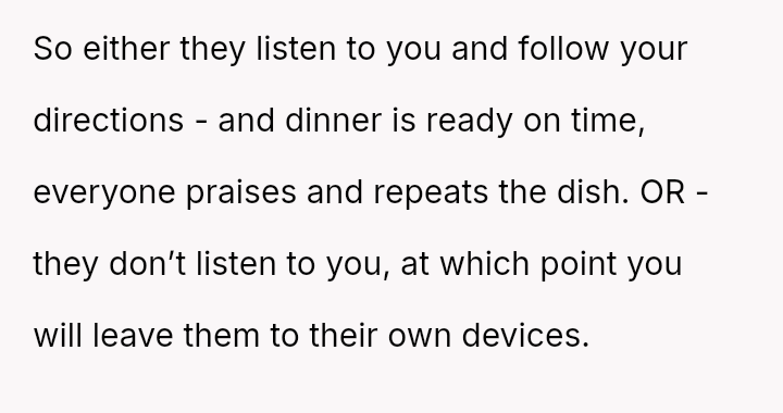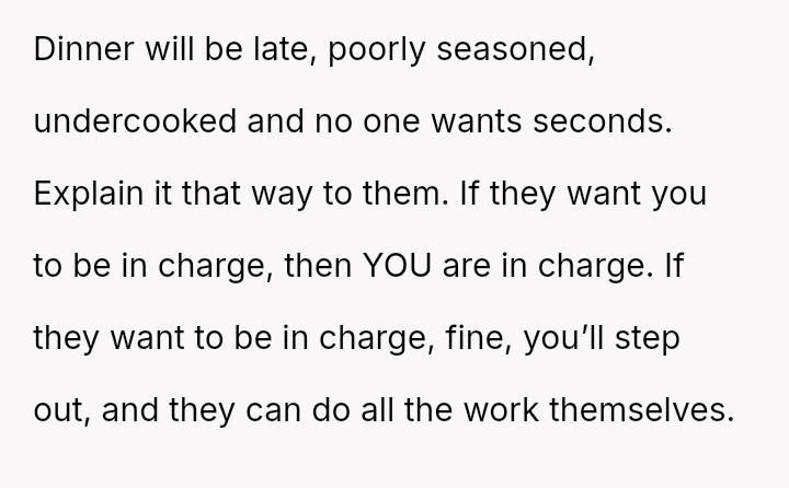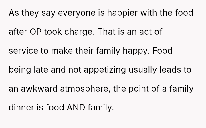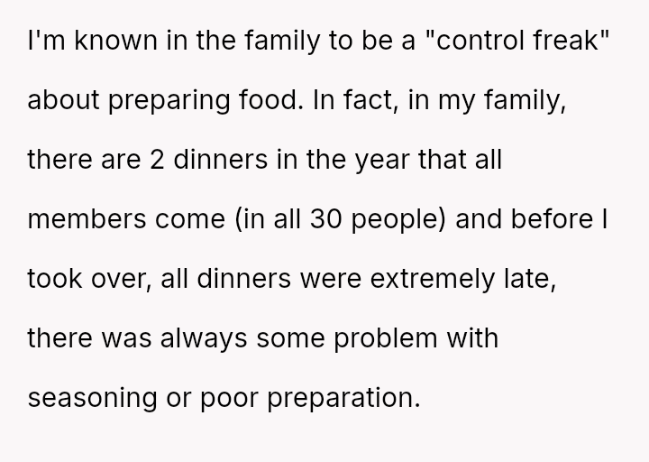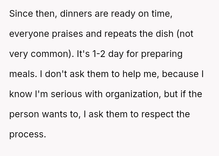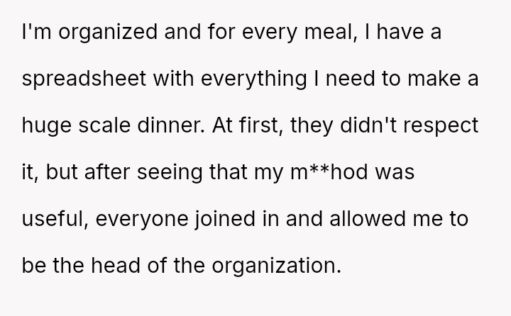 The original poster (OP) manages highly organized, large-scale family meals, a role they took over due to previous failures.