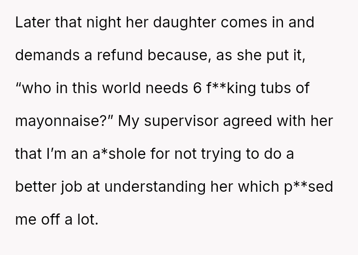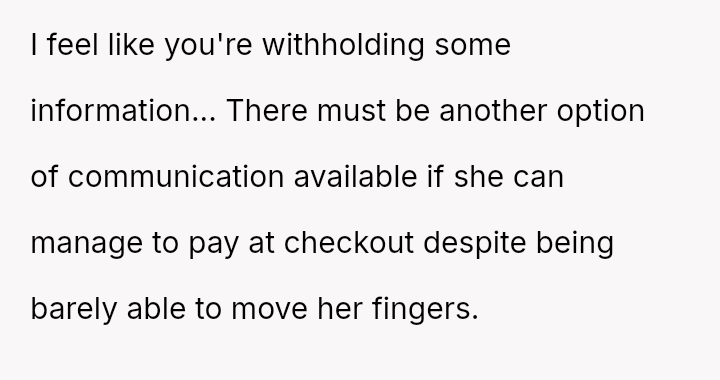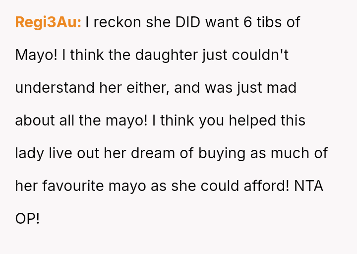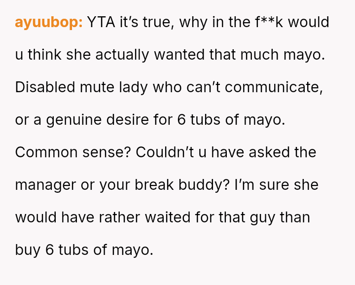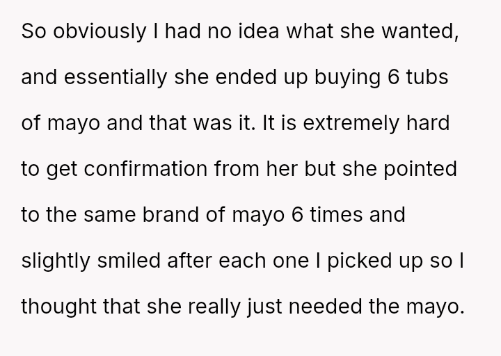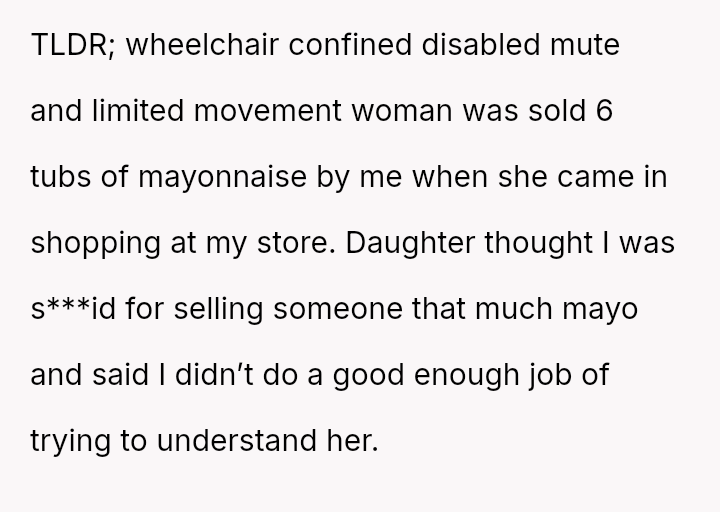 The original poster (OP) faced a challenging situation where they attempted to a*sist a customer with severe physical and communication disabilities, resulting in an unintended purchase of six tubs of mayonnaise.