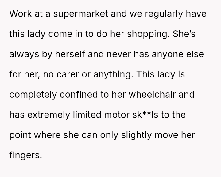 Every day, a silent story unfolds in the aisles of the supermarket—a woman bound to her wheelchair, trapped within her own body, her eyes pleading for connection in a world that barely pauses for her.