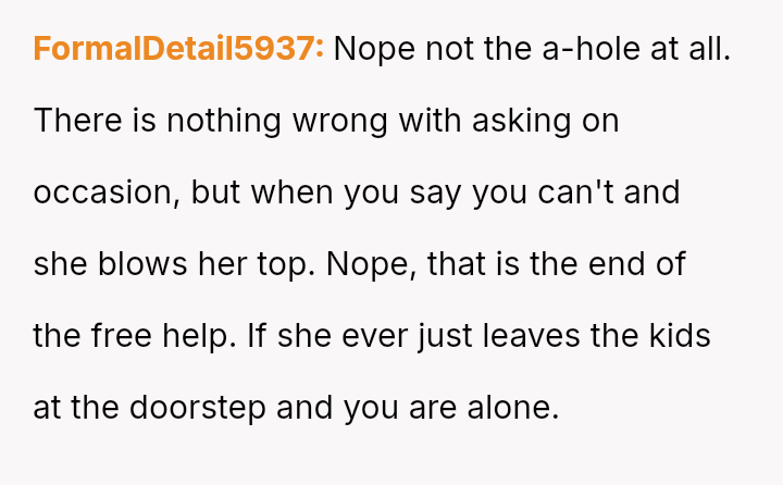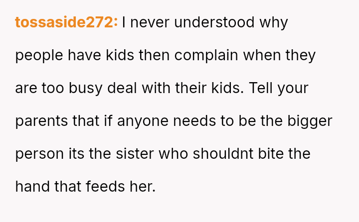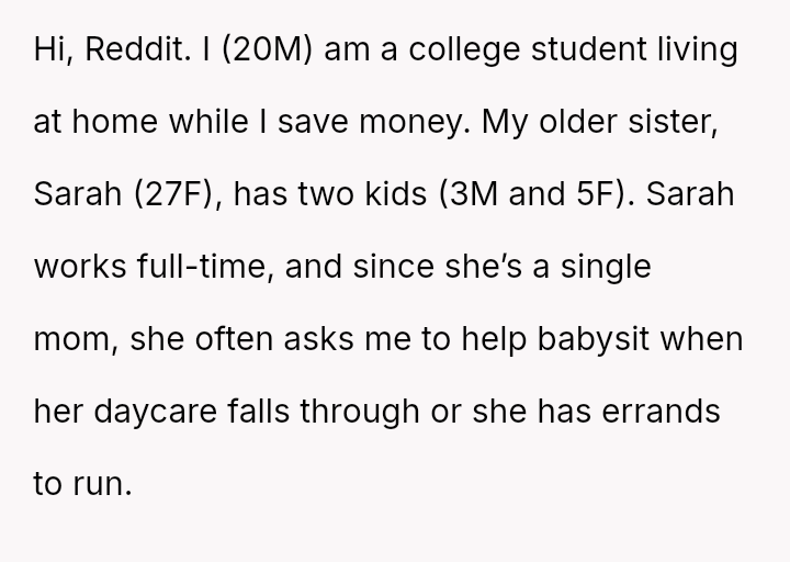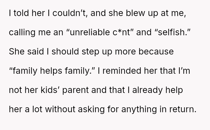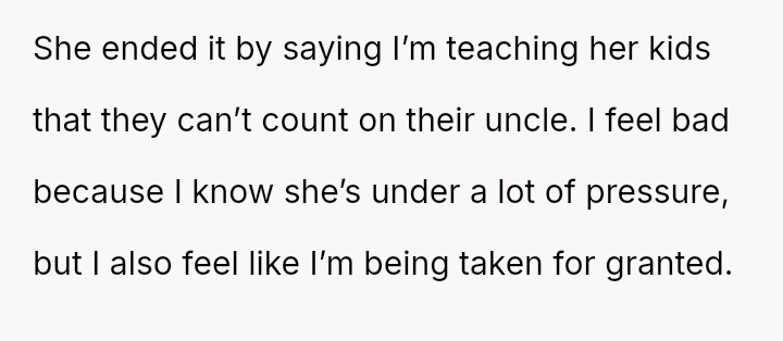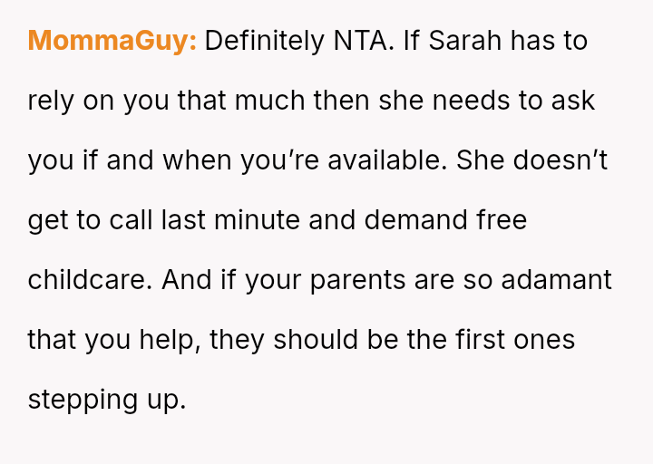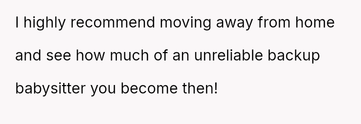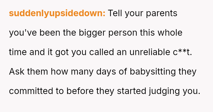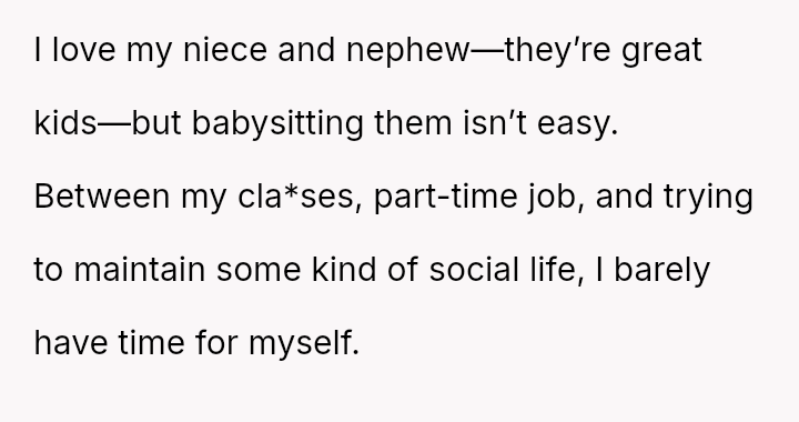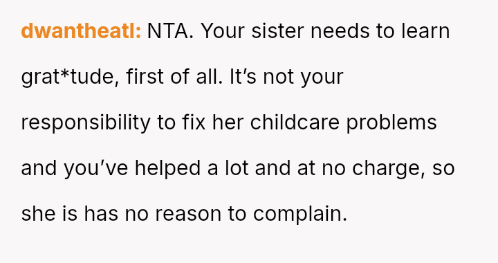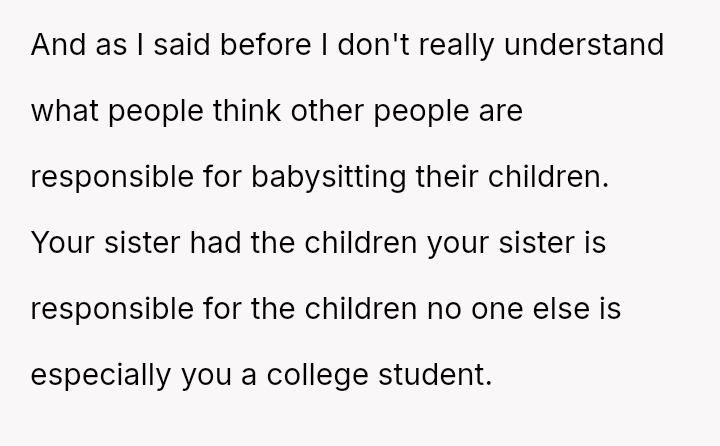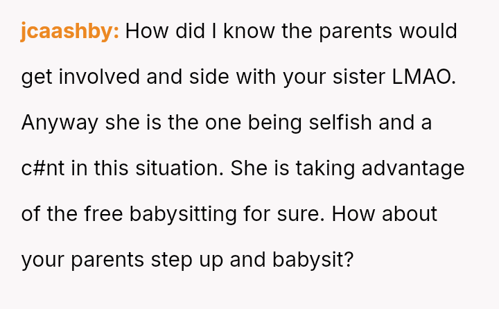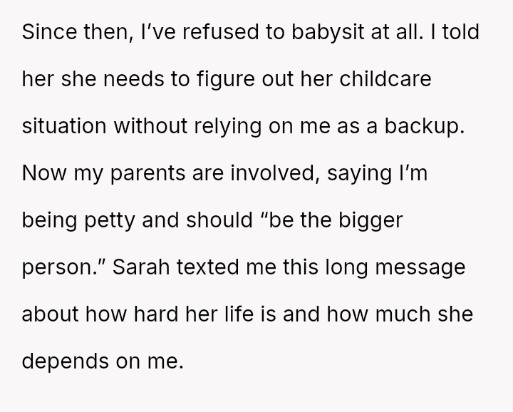 His decision to stop all babysitting has created a major conflict, leading to verbal a**se from his sister and pressure from his parents to conform to the expectation that family must always provide free, on-demand support.