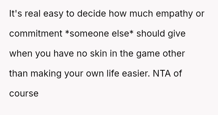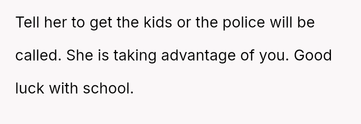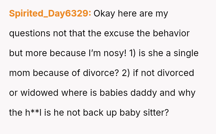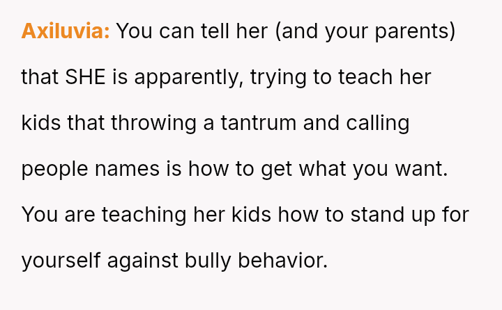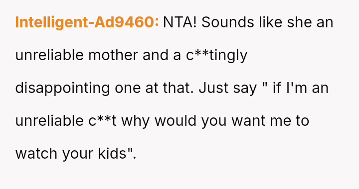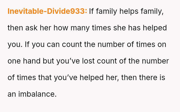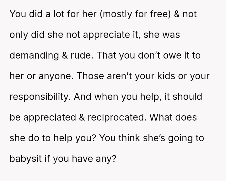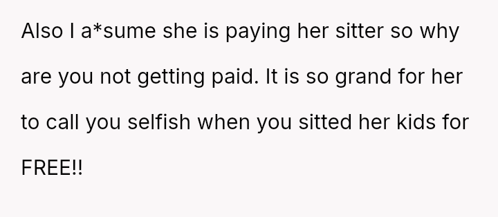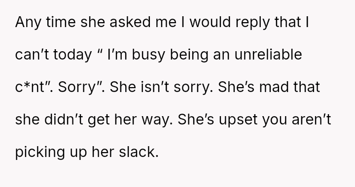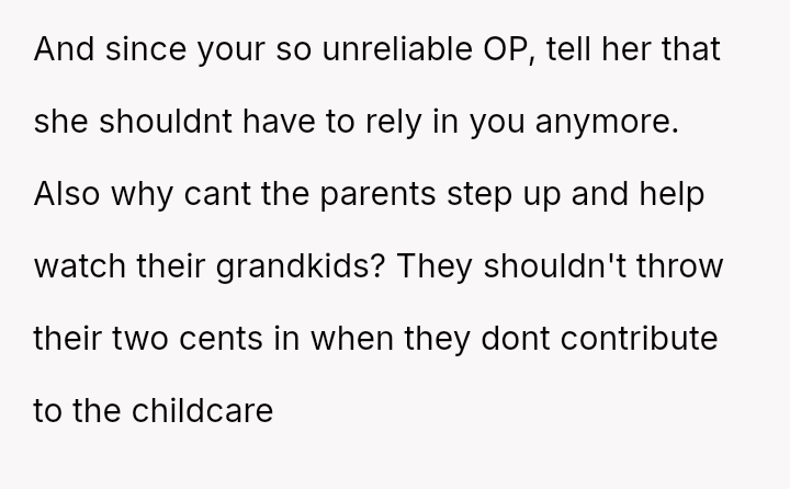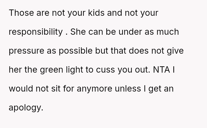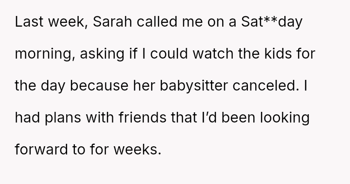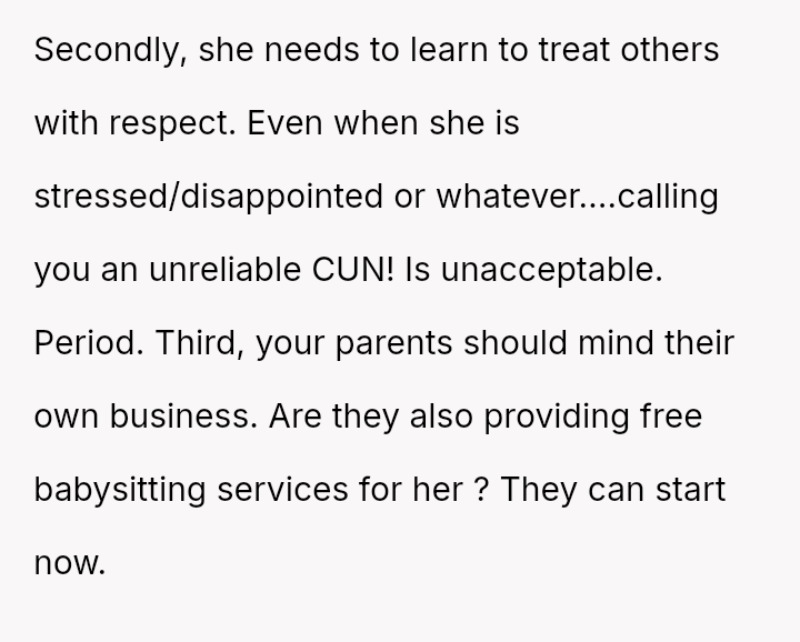 His decision to stop all babysitting has created a major conflict, leading to verbal a**se from his sister and pressure from his parents to conform to the expectation that family must always provide free, on-demand support.