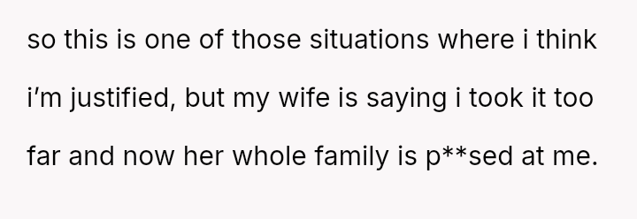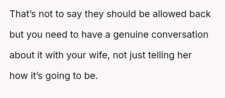 The OP reacted by setting a firm boundary, refusing contact with the family and banning them from his home, which his wife views as an overreaction that is causing a major rift.