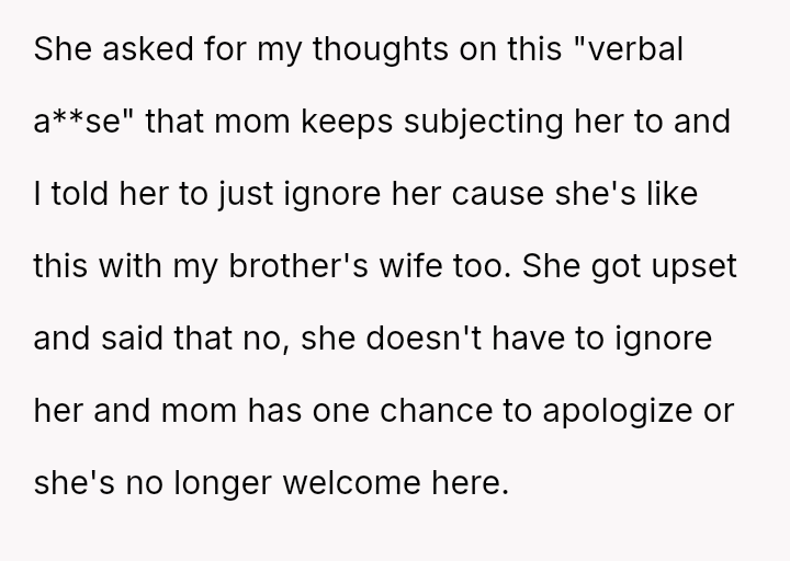 Given the mother's history of critical behavior and the wife's clear boundary regarding protecting the children from verbal a**se, is the wife justified in issuing an ultimatum demanding an apology, or is the OP correct that prohibiting future visits for the children's sake is an overreaction by his wife?