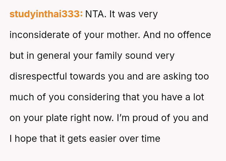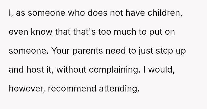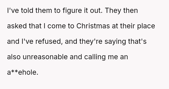 Her family is now pressuring her to reverse her decision, accusing her of being unreasonable for prioritizing her immediate, delicate household needs over their previously made arrangements.