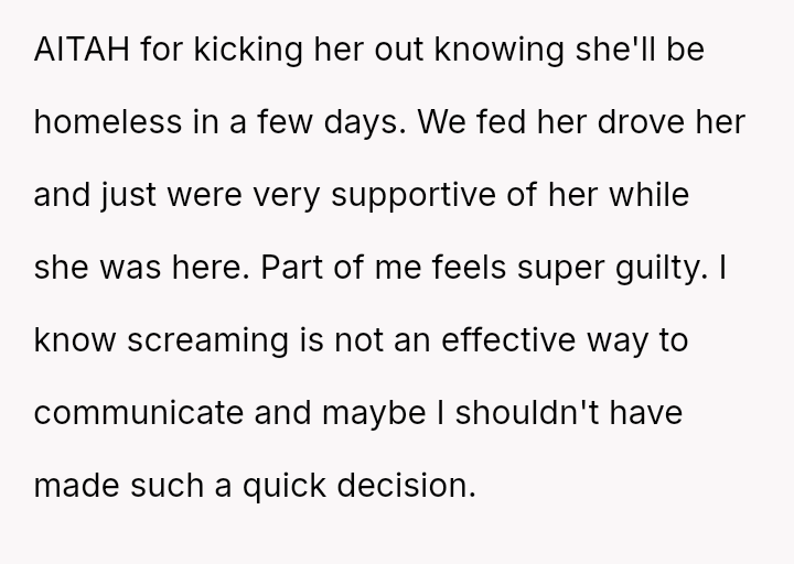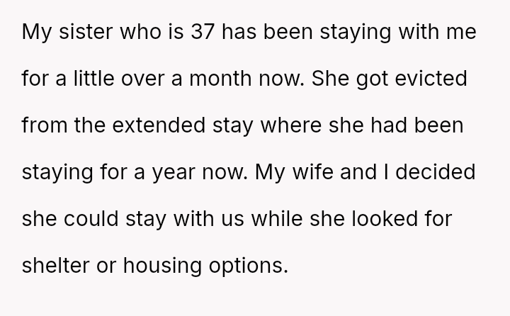 This event triggered an intense emotional reaction, leading the OP to immediately terminate the arrangement and ask his sister to leave, despite feeling guilty about her subsequent homelessness.