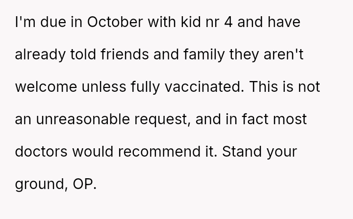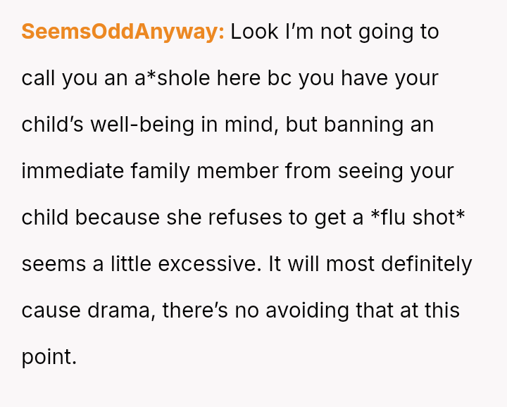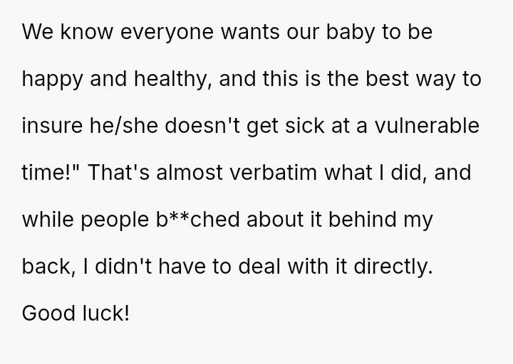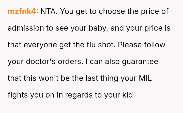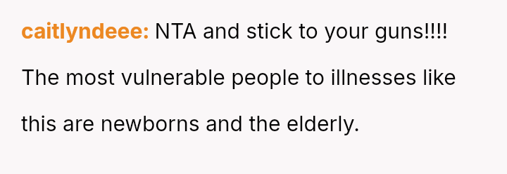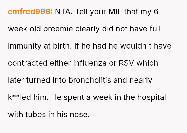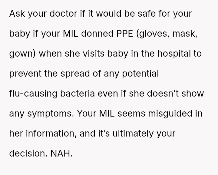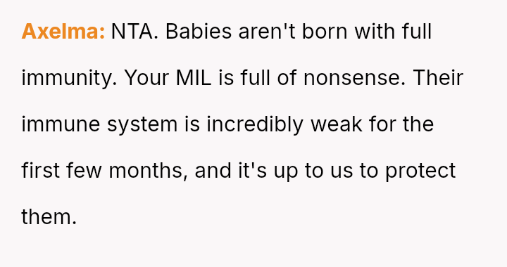 Given the conflicting priorities of expert medical advice versus familial harmony and individual autonomy, the central question remains: To what extent should new parents enforce medical safeguards on close family members, even if those requests cause interpersonal friction, and is the MIL's refusal justifiable when balanced against the documented risks to a vulnerable newborn?