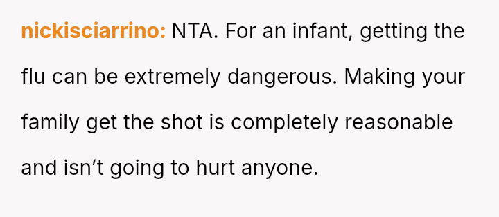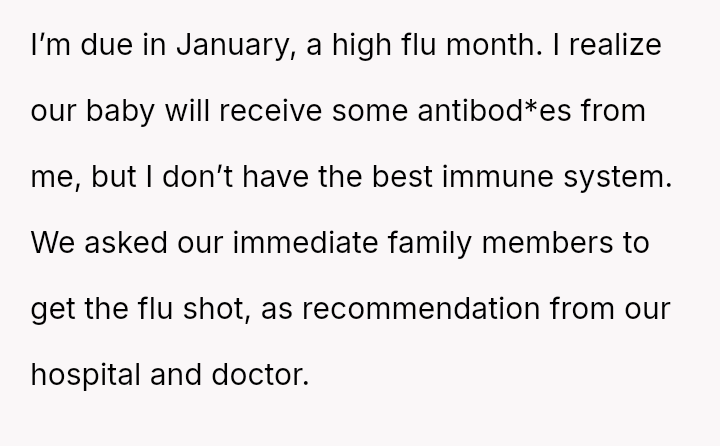 The original poster (OP) is experiencing significant anxiety regarding the health of their newborn, prioritizing preventative medical measures recommended by professionals, specifically concerning flu vaccination among close contacts.