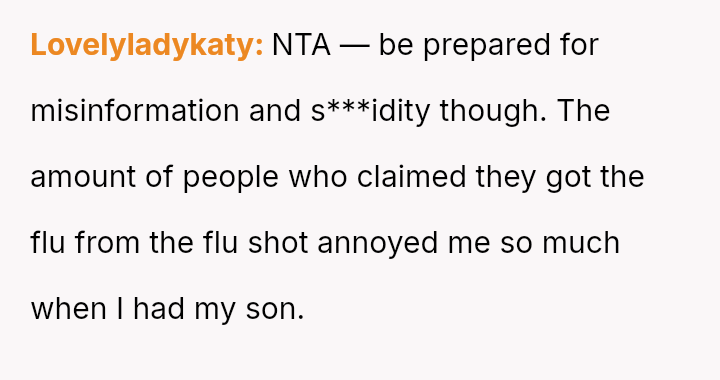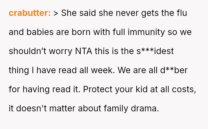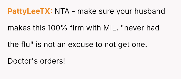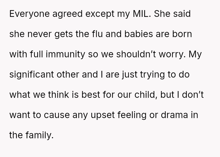This places them in direct conflict with the mother-in-law (MIL), who dismisses these medical recommendations based on personal belief and perceived immunity, creating tension between the OP's desire to protect their child and the wish to maintain family peace.