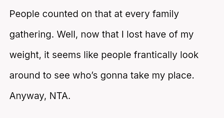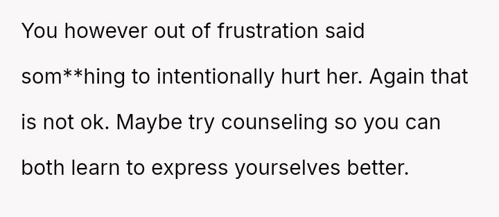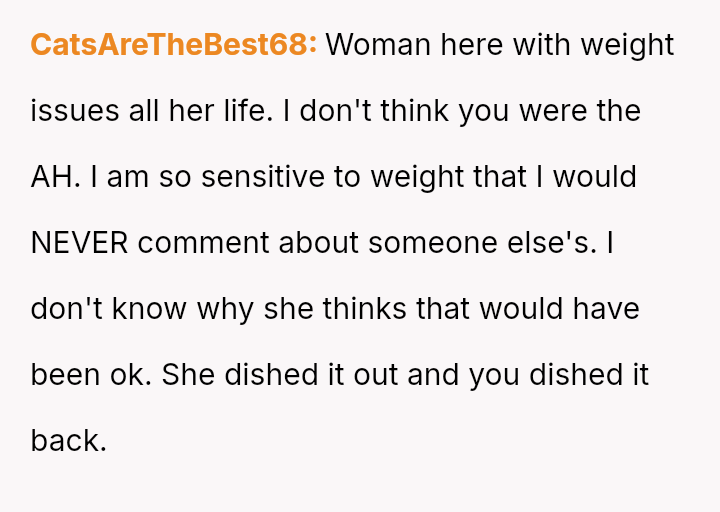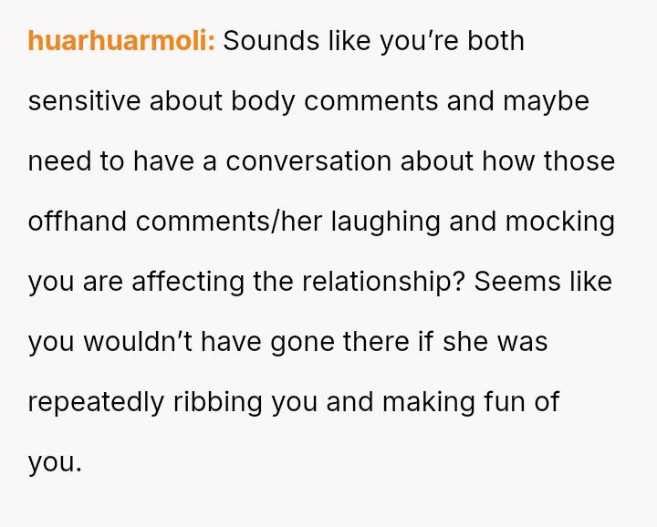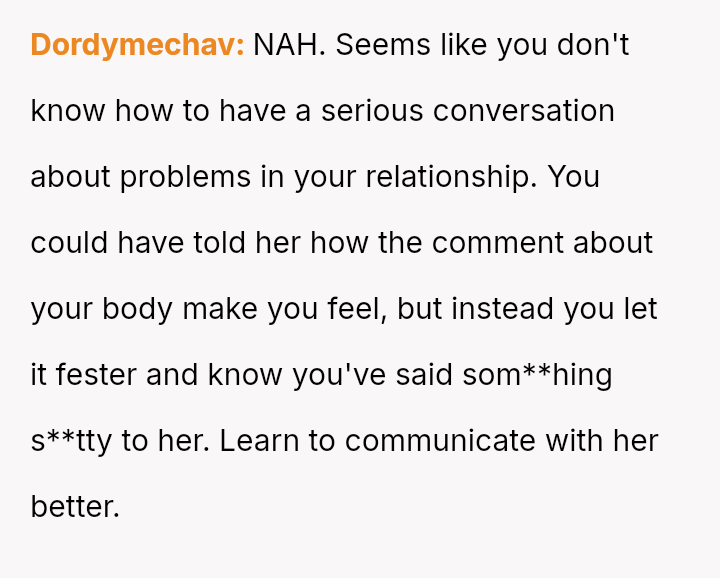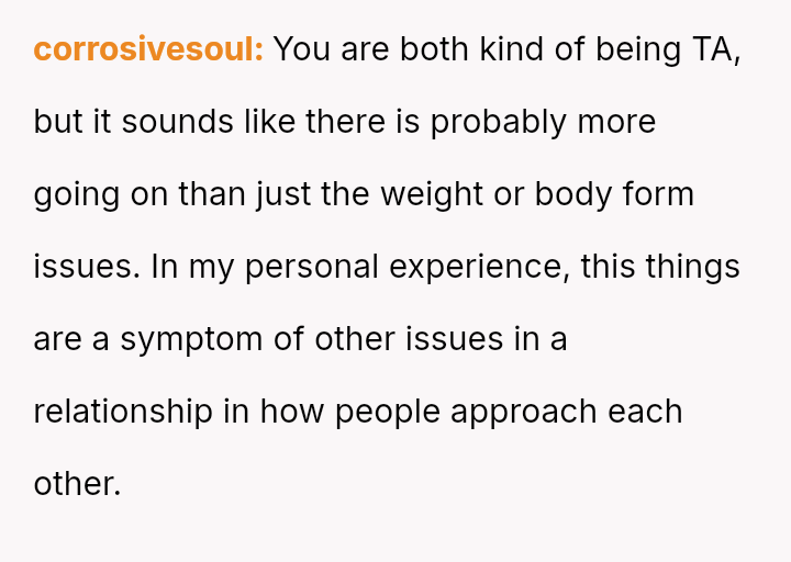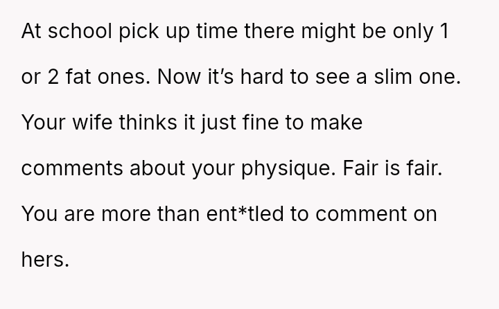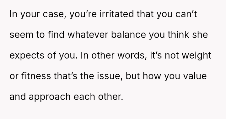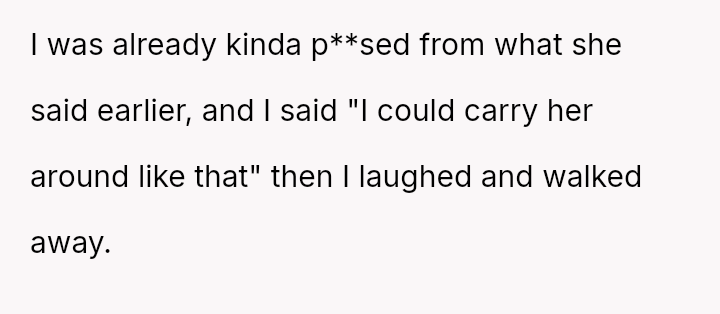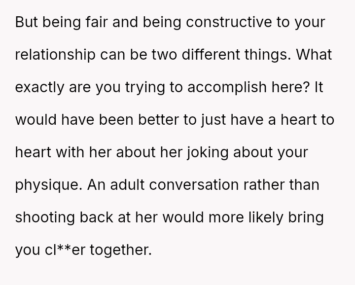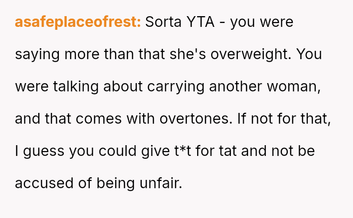 The original poster (OP) feels hurt and disrespected because his wife frequently criticizes his physique, suggesting he needs to gain weight, while simultaneously reacting angrily when he makes a similar, though provoked, comment about her ability to be carried like on television.