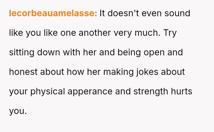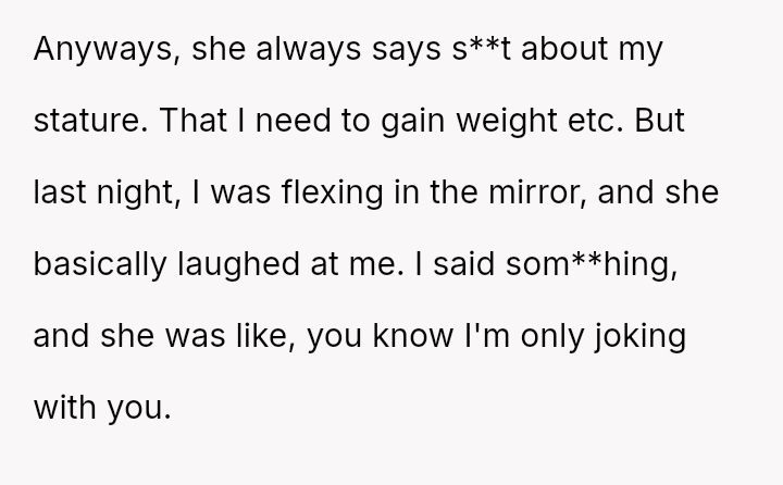 The central conflict lies in the OP feeling that his wife demands respect for her body image while actively undermining his self-perception through repeated comments and laughter about his build.