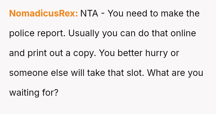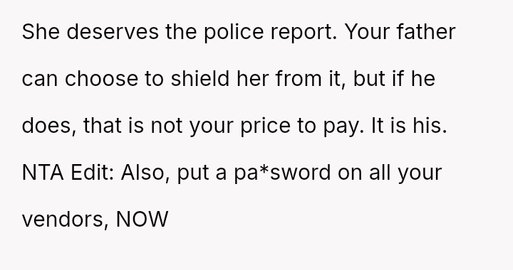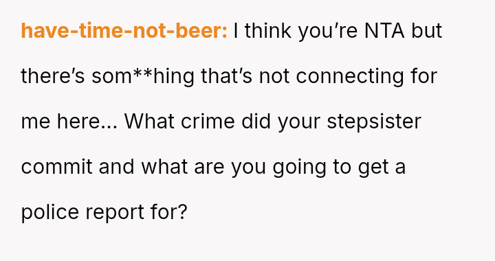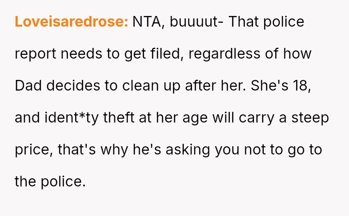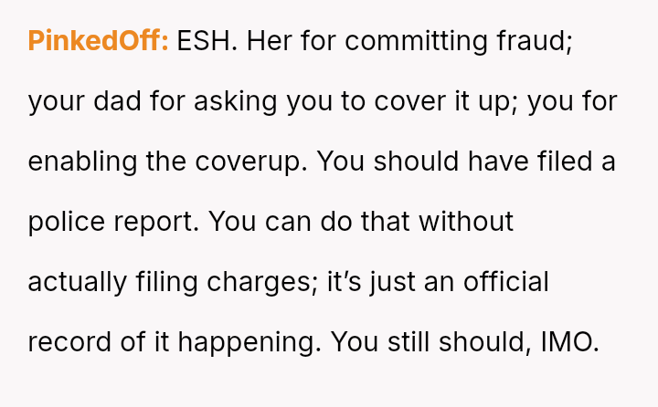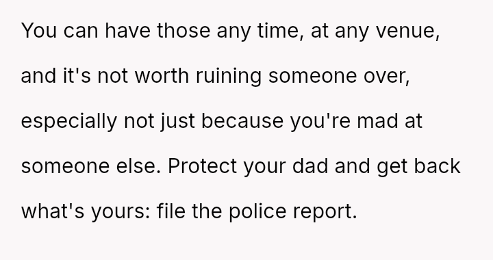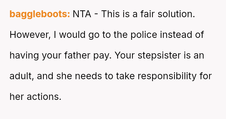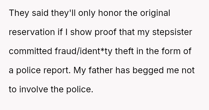The central conflict arises from the OP's demand that the stepsister's actions must result in a police report for fraud, a condition their father strongly opposes, leading the OP to shift the financial burden of the price hike onto the father.