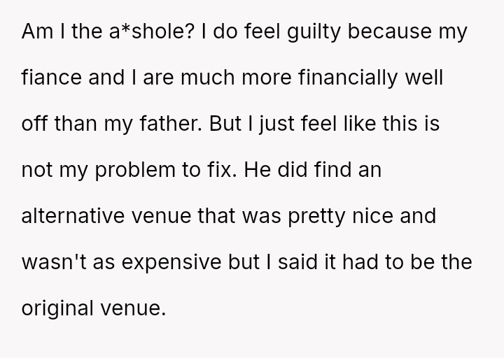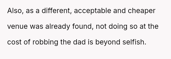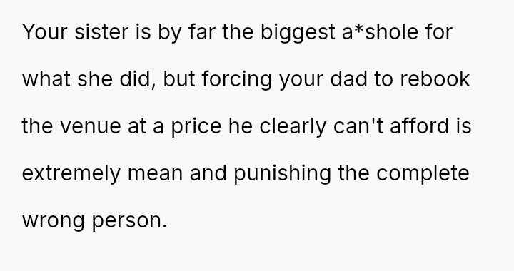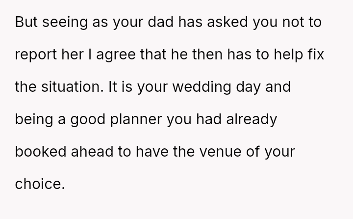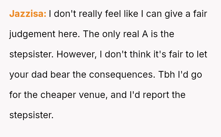 Is the OP justified in refusing the alternative venue and forcing their father to cover the inflated cost unless a police report is filed against the stepsister, or is this an unfair escalation, especially considering the OP's superior financial standing compared to their father?