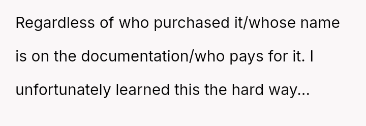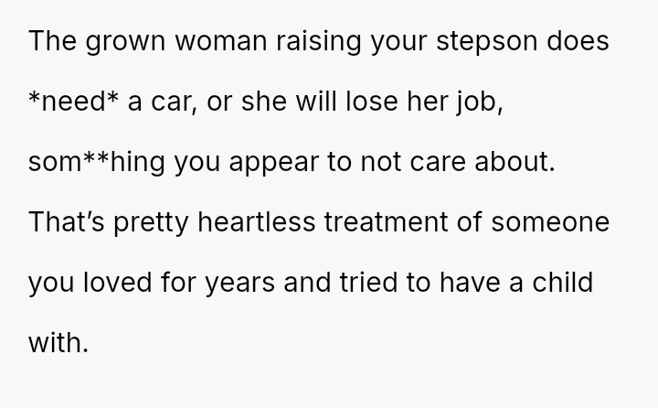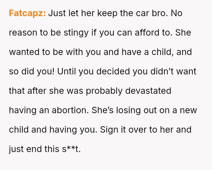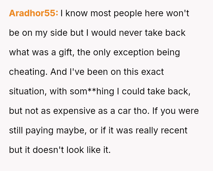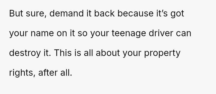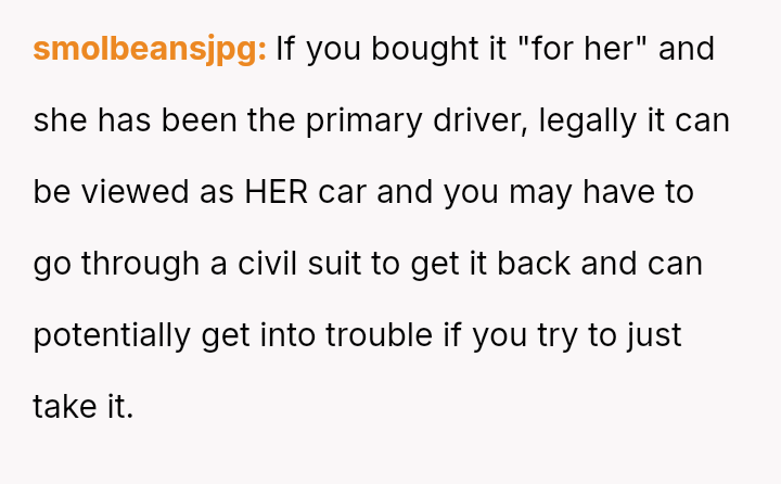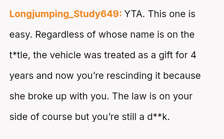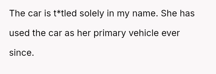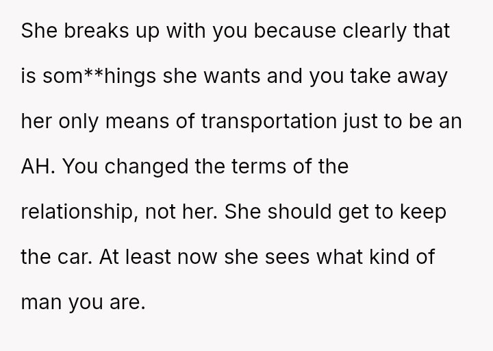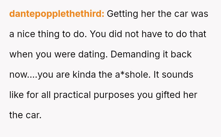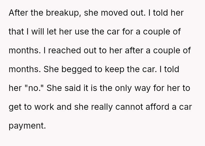 The original poster (OP) is facing conflict because his ex-partner insists on keeping a car he purchased and solely owns, despite their relationship ending.