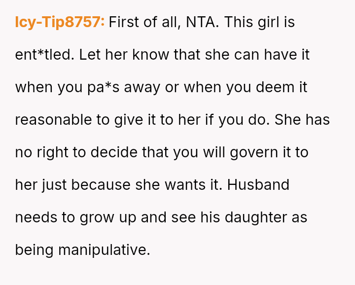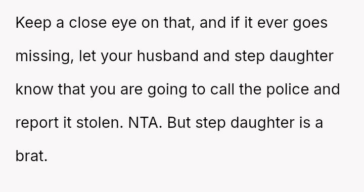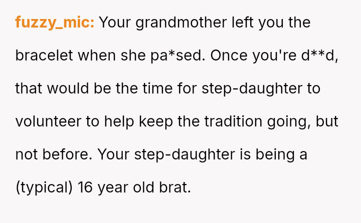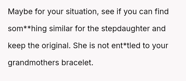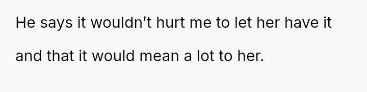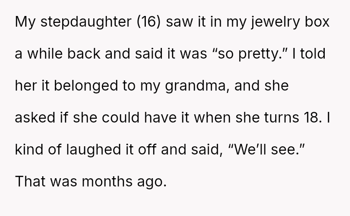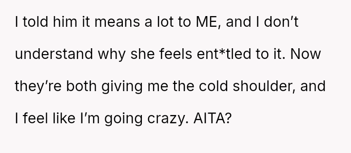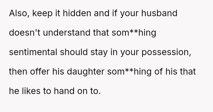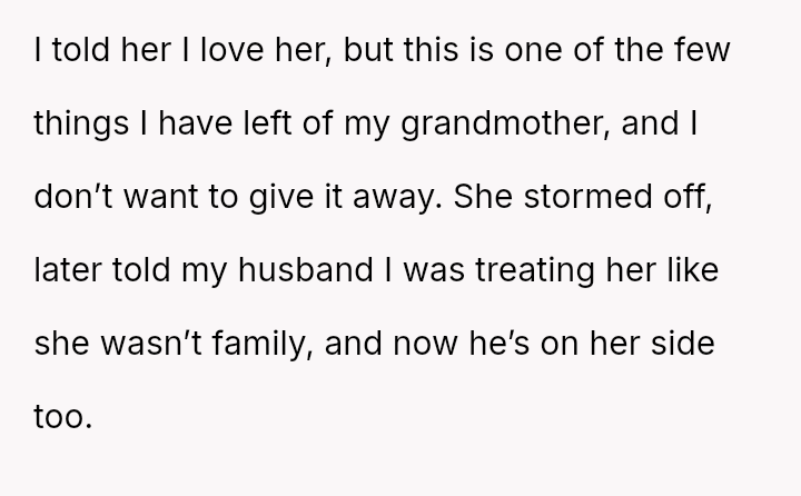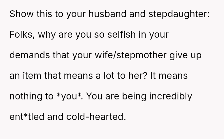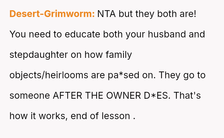 The central conflict is between the OP's deeply personal attachment to the heirloom and the stepdaughter's expressed sense of ent*tlement to it, which is further complicated by the husband siding against the OP regarding this item.