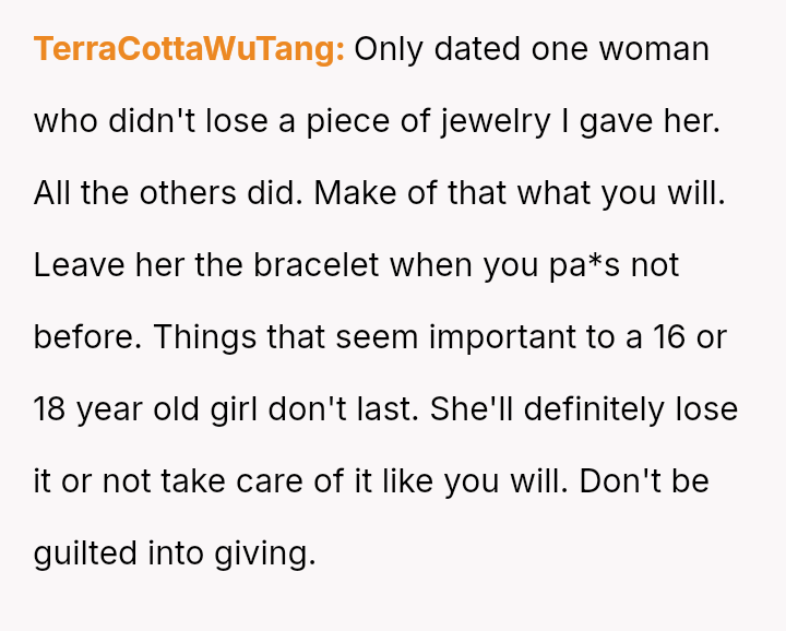 Given that the OP never explicitly promised the bracelet, is their refusal to surrender a cherished heirloom an act of self-preservation regarding personal property and memory, or is it perceived by their family as an unfair denial of a significant milestone gift, causing undue division?