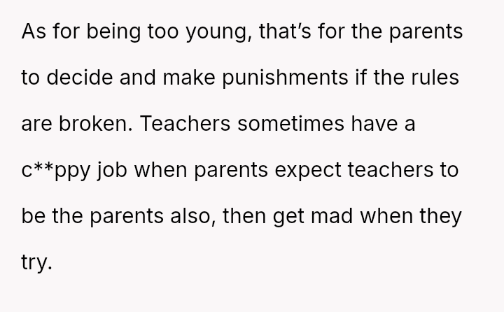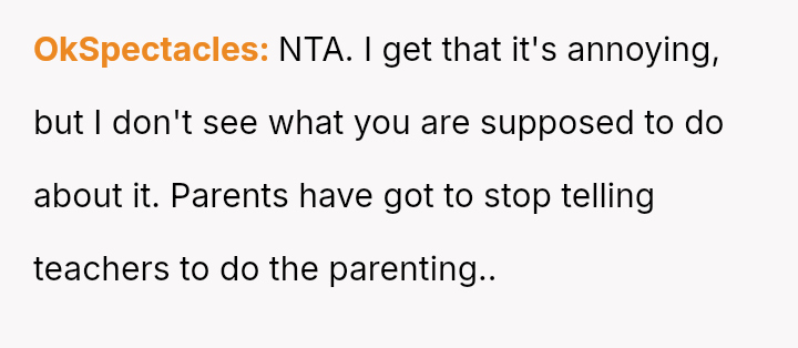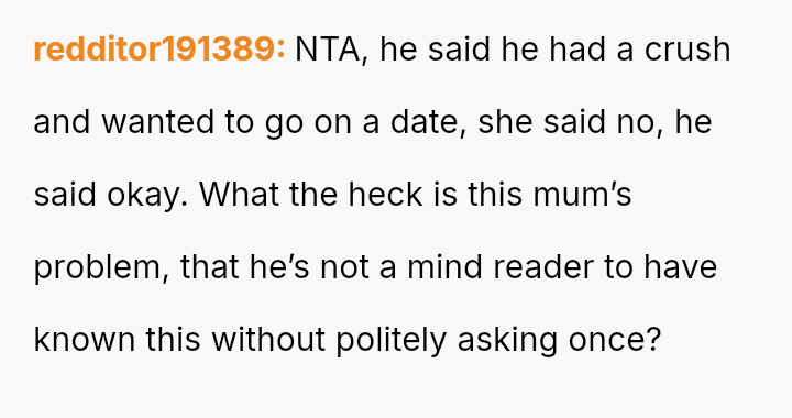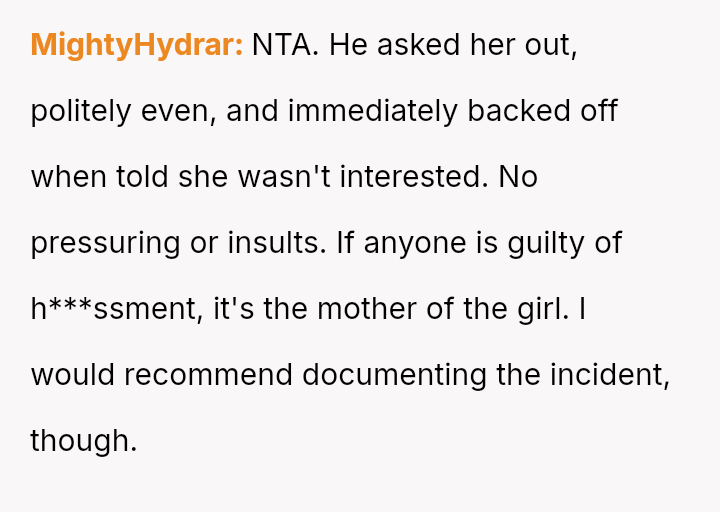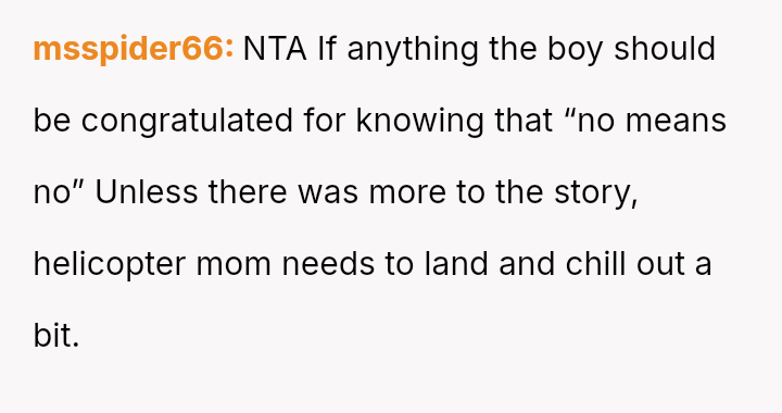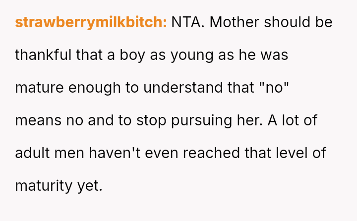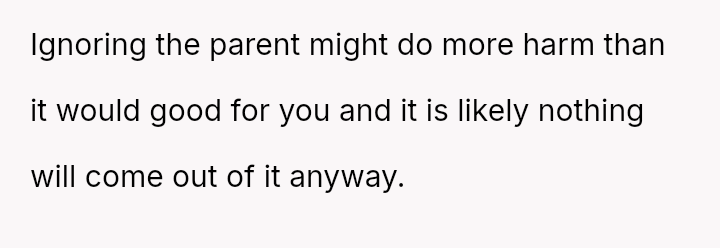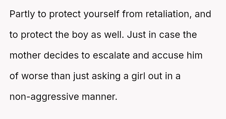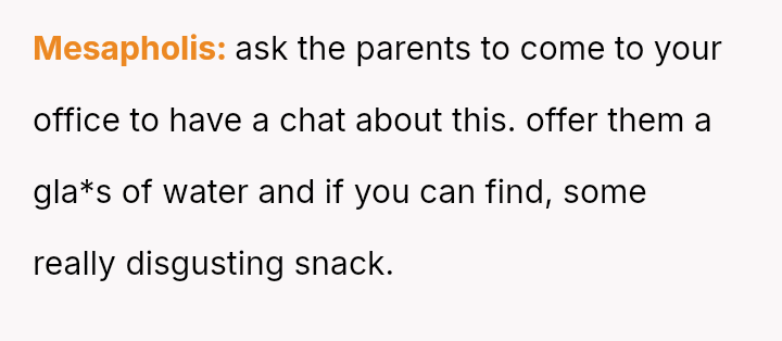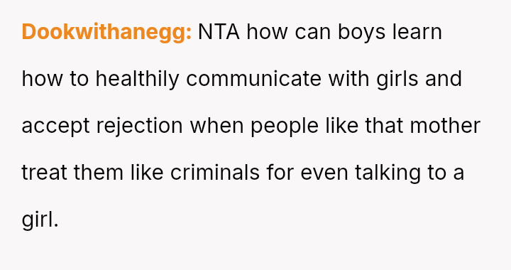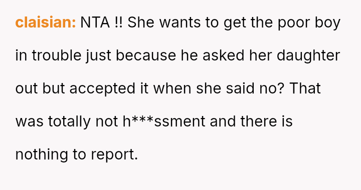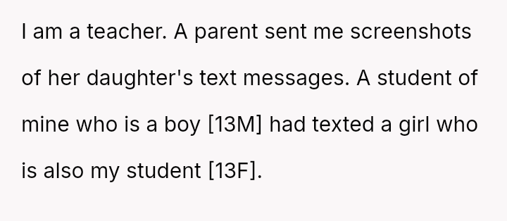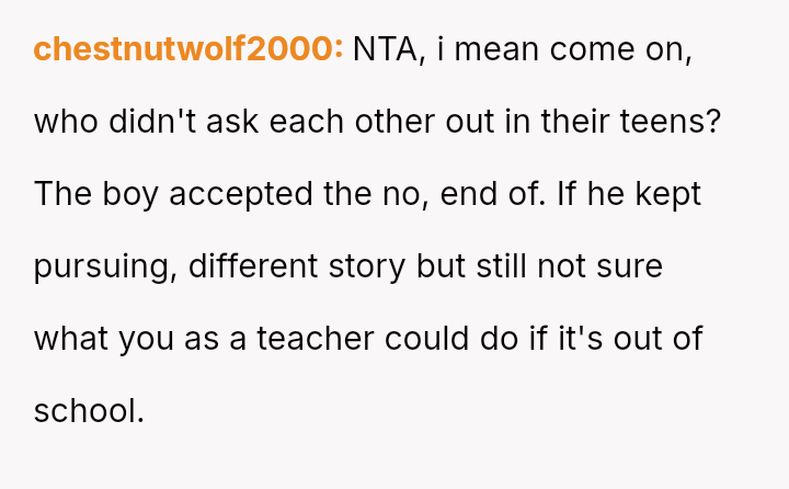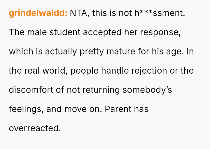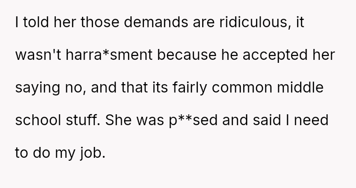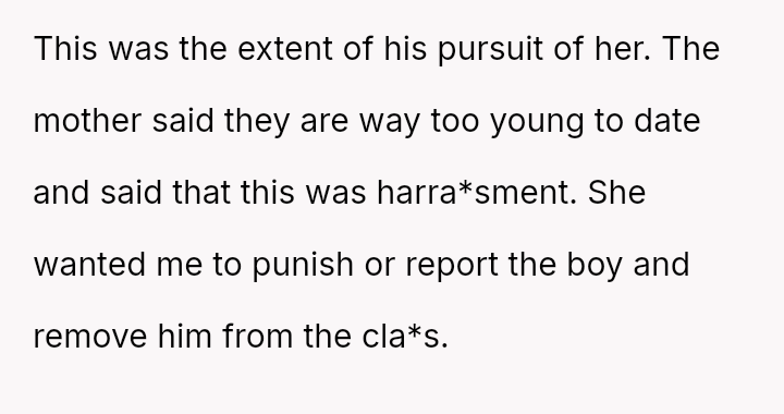 Given the clear rejection of the advance and the parent's perception of h***ssment versus the OP's view of typical behavior, the central question remains: Where is the appropriate boundary for teacher intervention when a parent demands disciplinary action for minor, self-resolving student communication that does not v***ate school conduct codes?