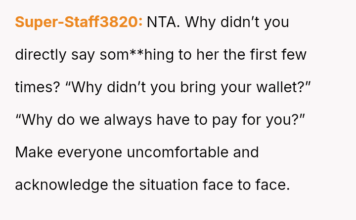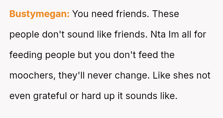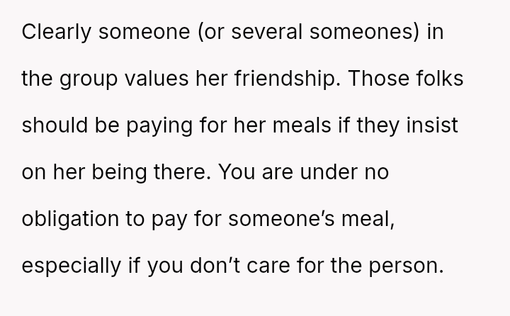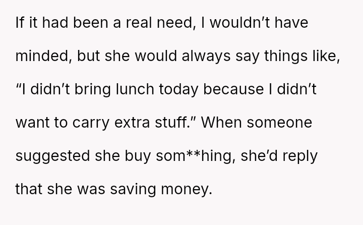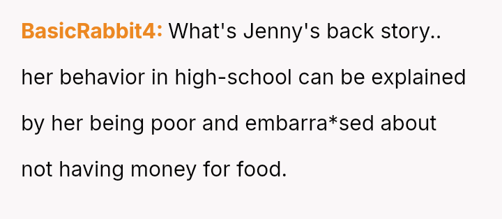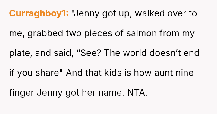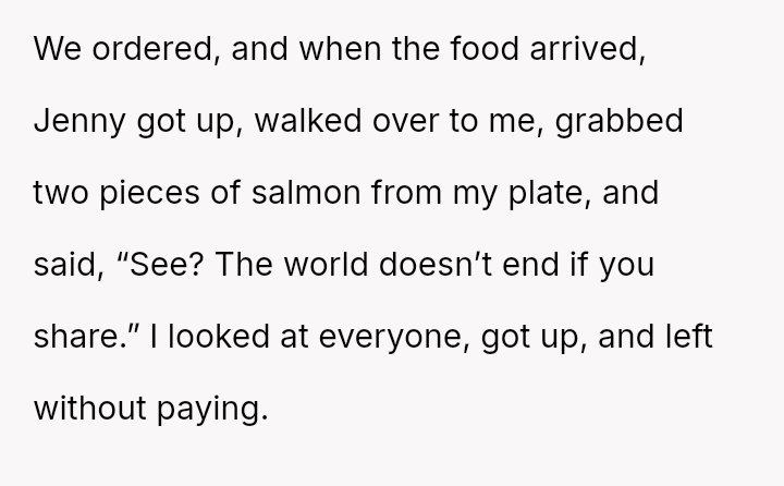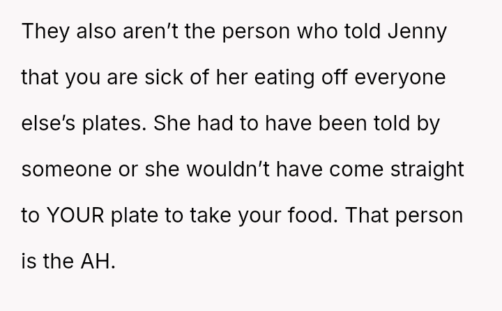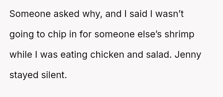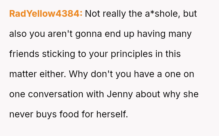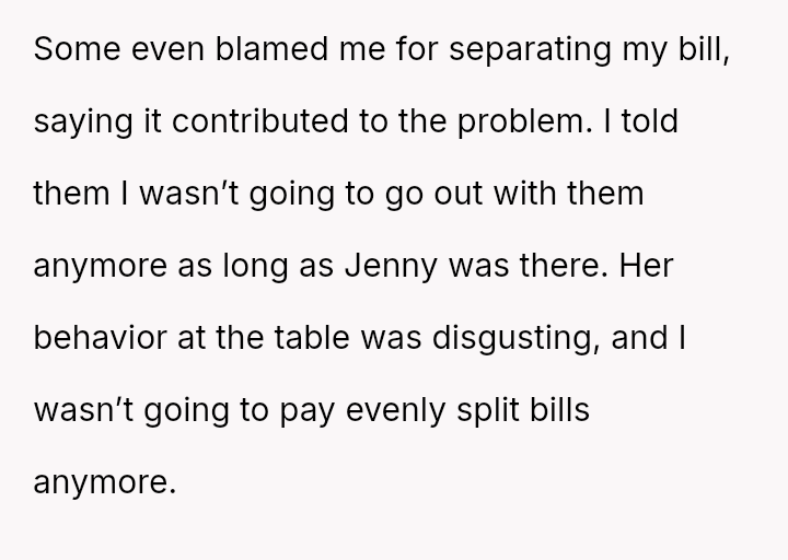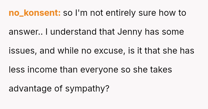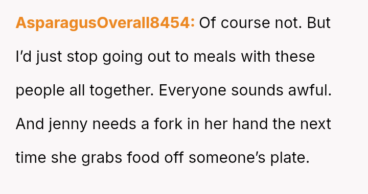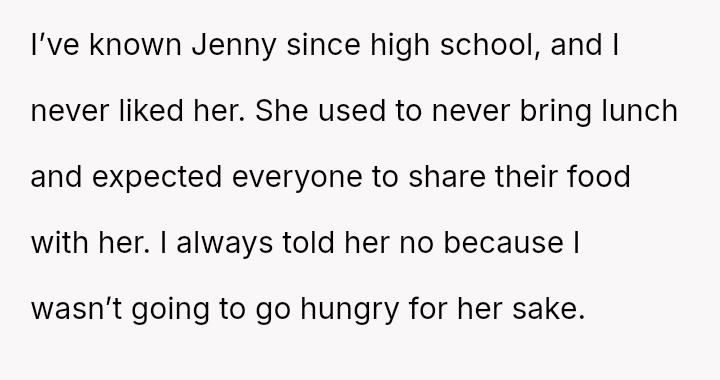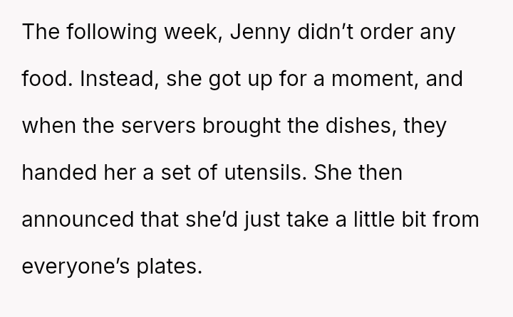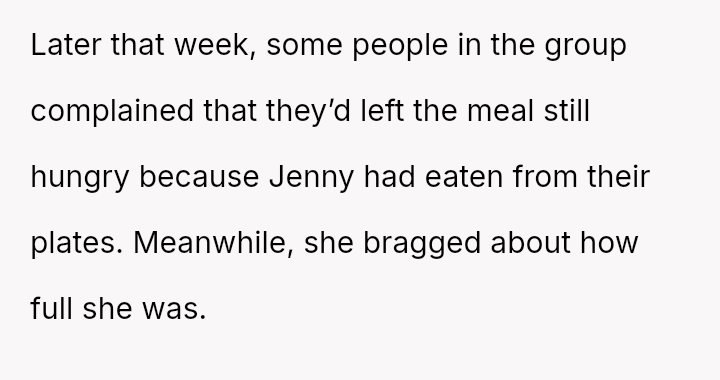 The original poster (OP) consistently felt taken advantage of by Jenny, primarily regarding shared food costs and poor table etiquette, leading to multiple attempts to set boundaries.