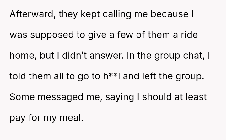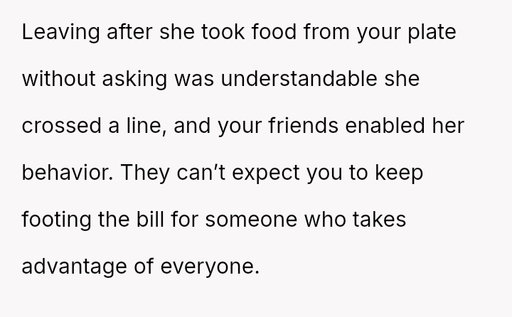 Was the OP justified in escalating their response to the point of abandoning the entire friend group and refusing to pay for their own meal after the final aggressive confrontation?