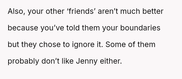 Or did the group's continued enabling of Jenny's ent*tlement and boundary v***ations necessitate such a decisive exit?