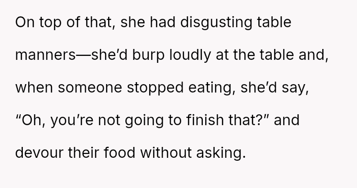 Her selfishness and crude behavior had cast a long shadow, turning simple meals into battlegrounds of patience and discomfort. As time pa*sed, walls were built and friendships strained, with some choosing distance over discord.
