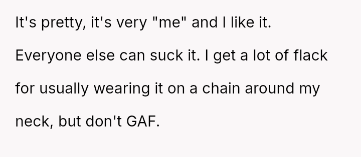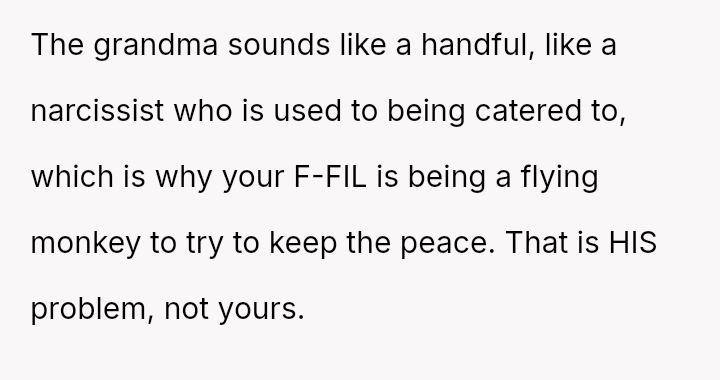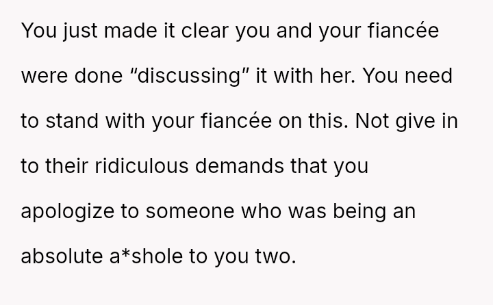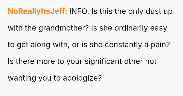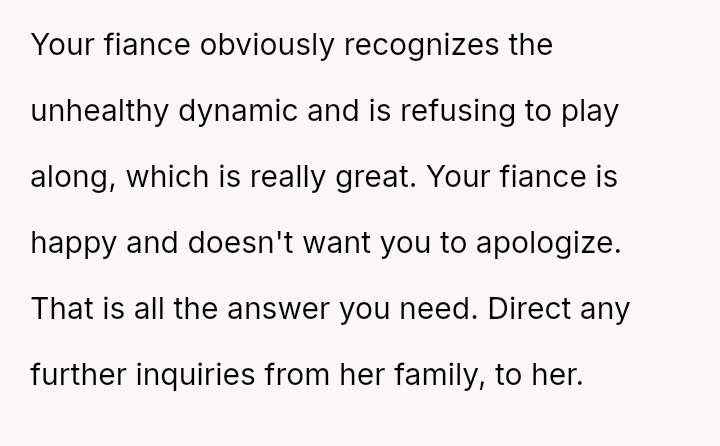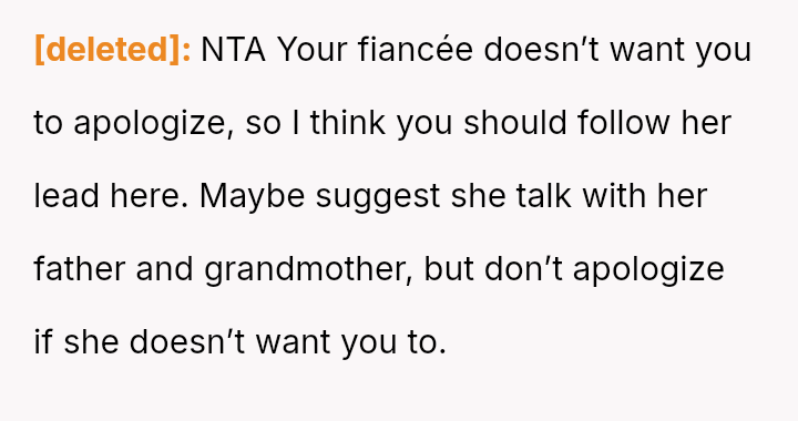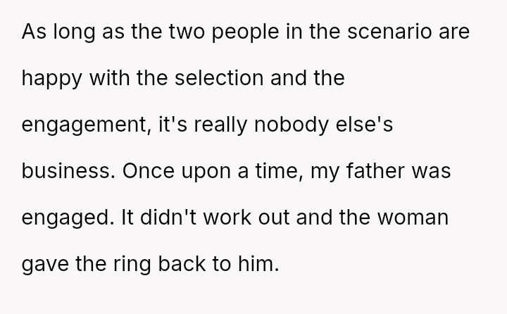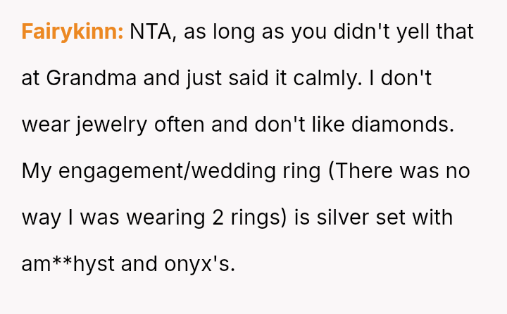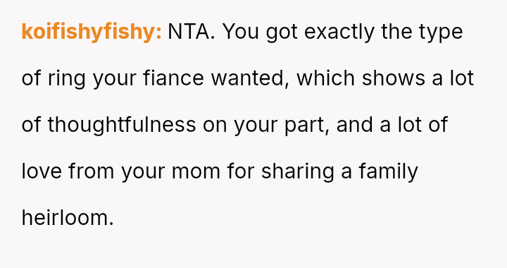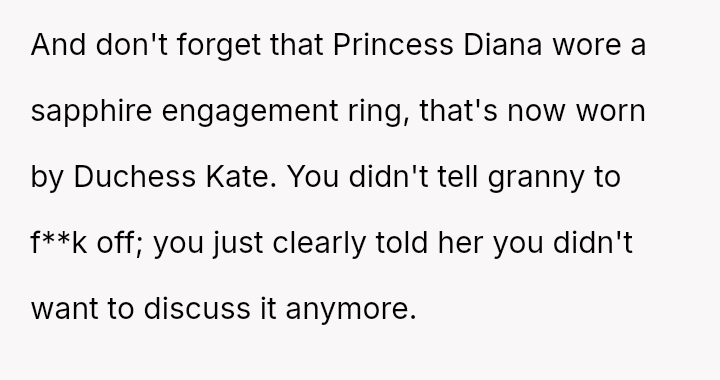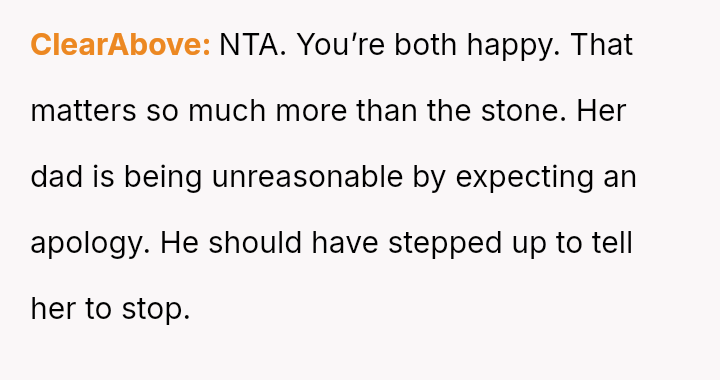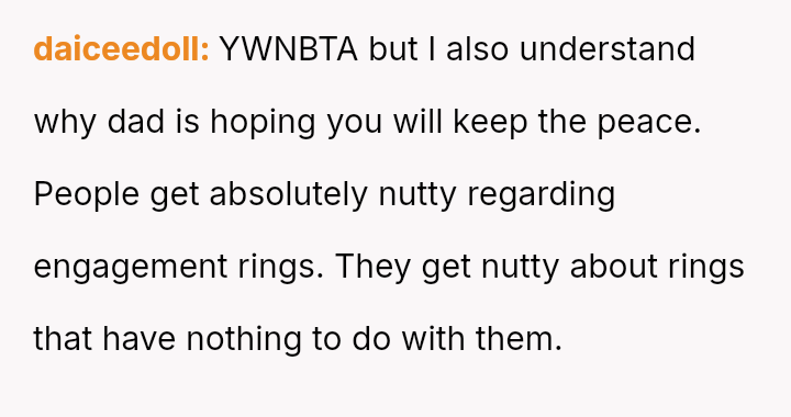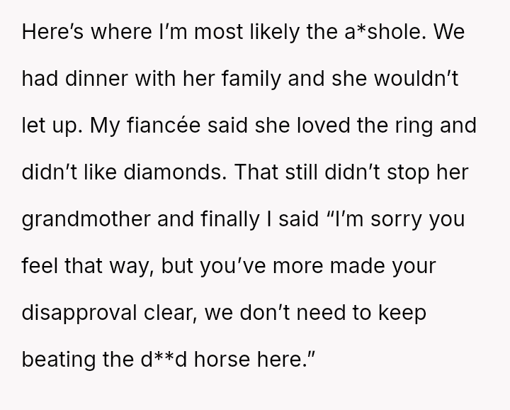Given that the fiancée supports the OP and loves the ring, is the OP obligated to apologize to the grandmother merely to appease the fiancée's father and maintain superficial family peace, or is standing firm on the appropriateness of his loving choice the correct path?