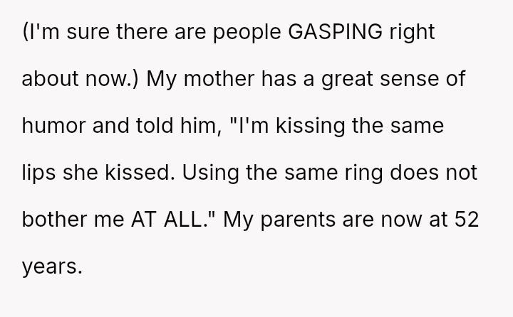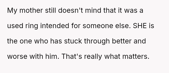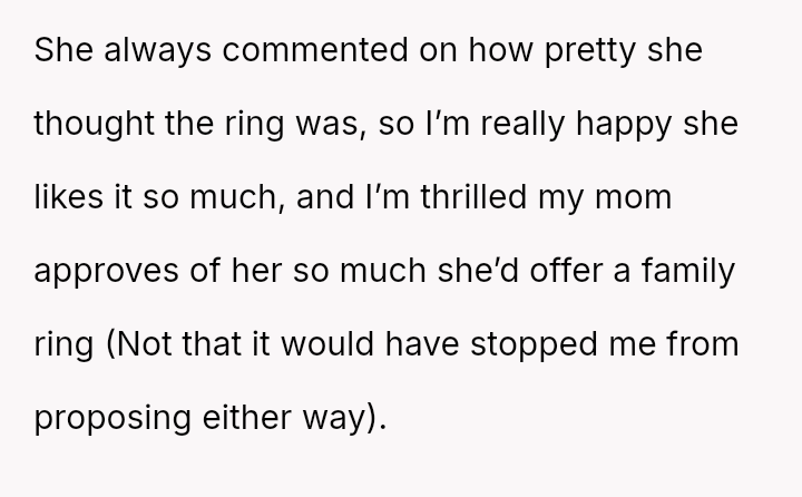 The original poster (OP) successfully proposed to his girlfriend using a meaningful family heirloom ring, which she genuinely loves.
