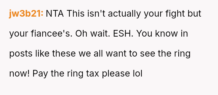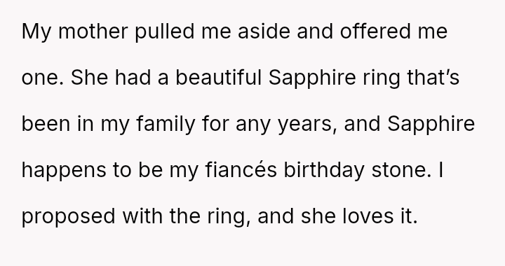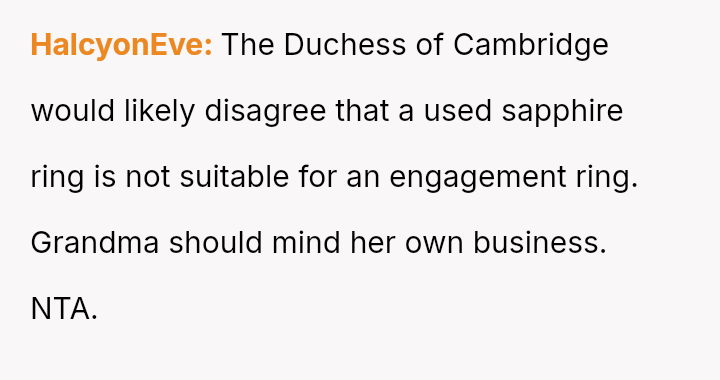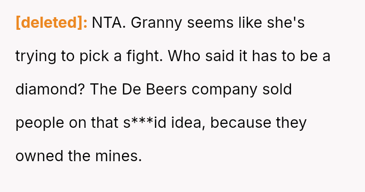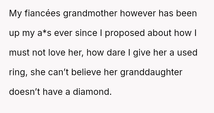 However, the fiancée's grandmother has strongly opposed this choice, focusing on the ring being pre-owned and not a diamond, leading to significant family tension and a demand for the wedding to be called off.