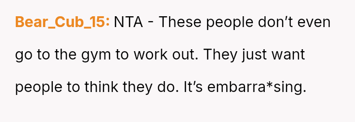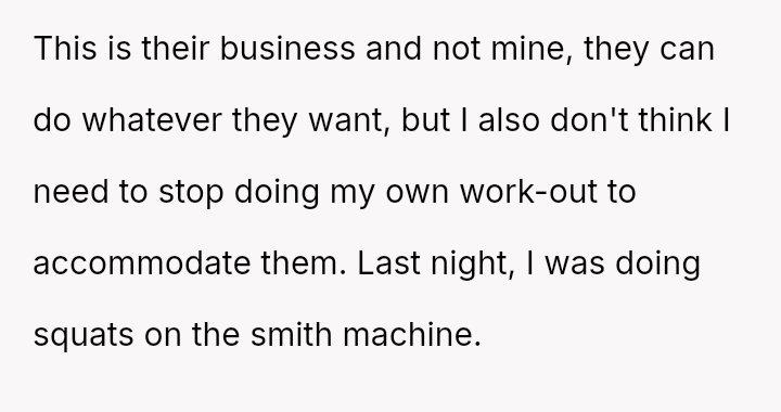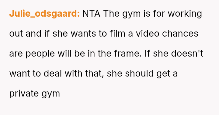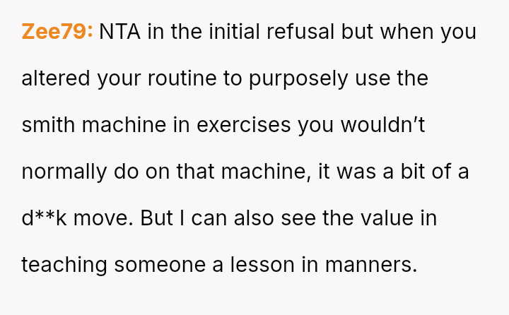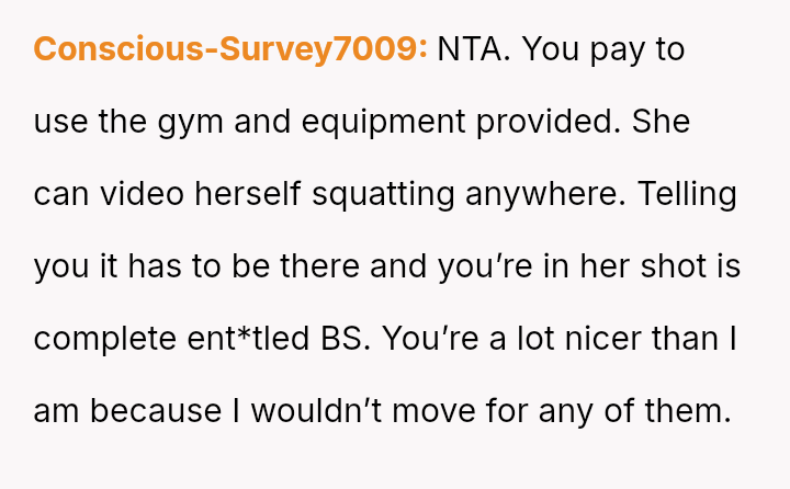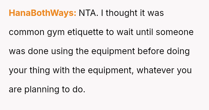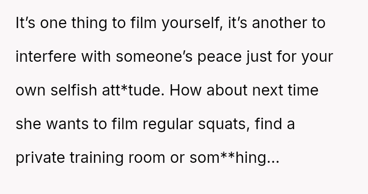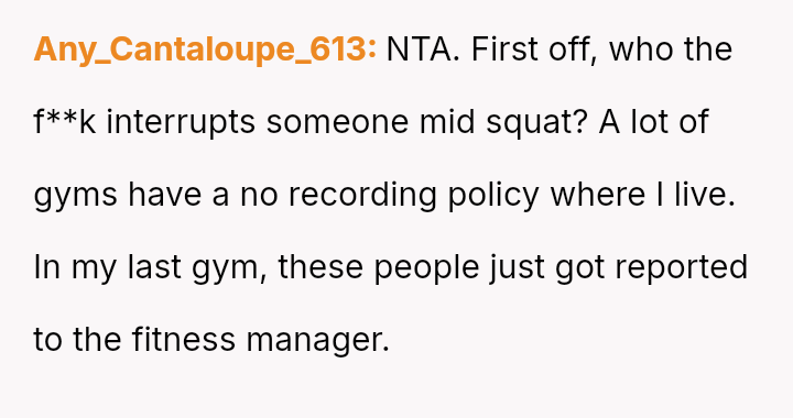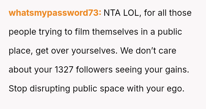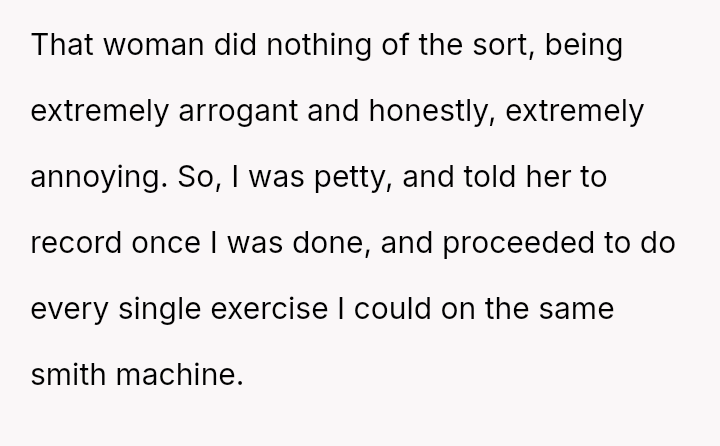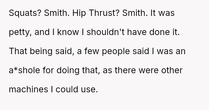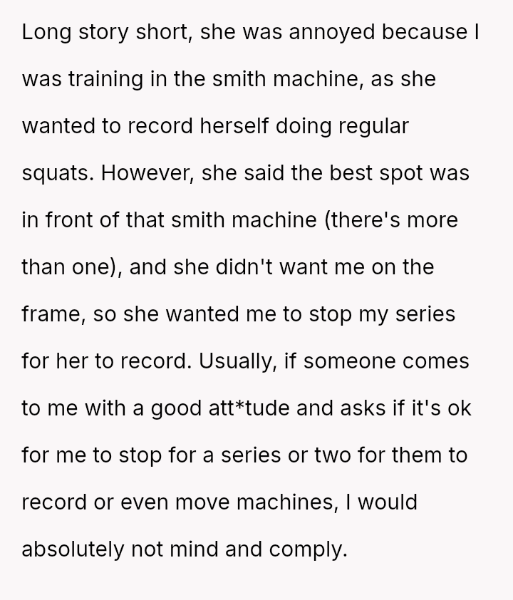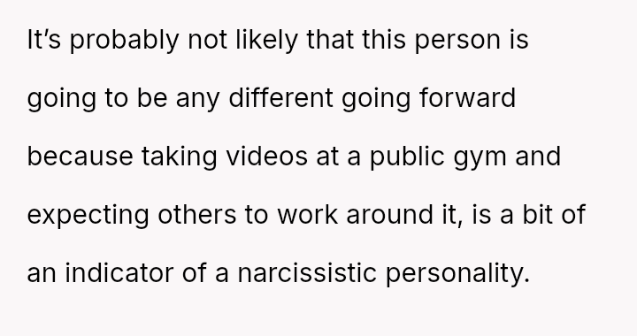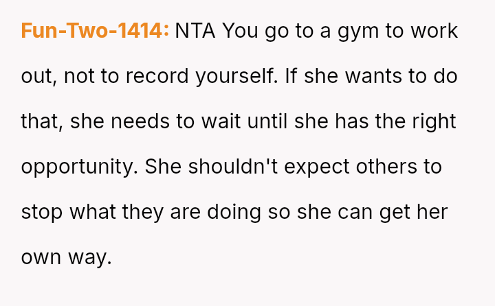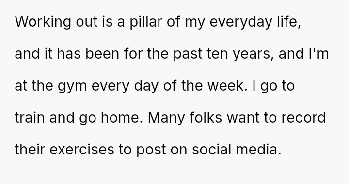The original poster (OP) felt their focused workout routine was disrupted by another gym member who aggressively demanded they stop using a specific machine for a video recording.