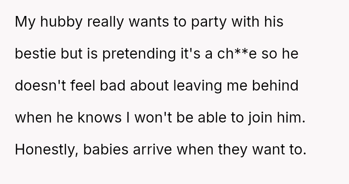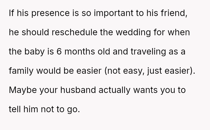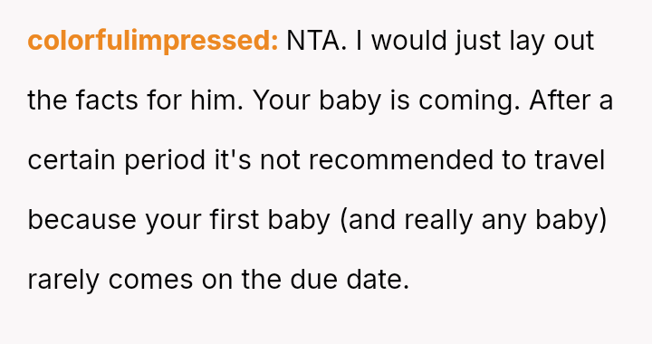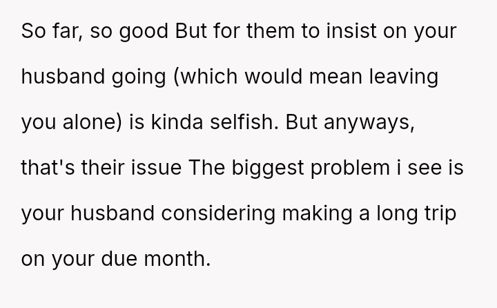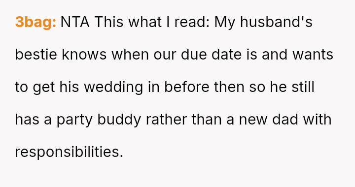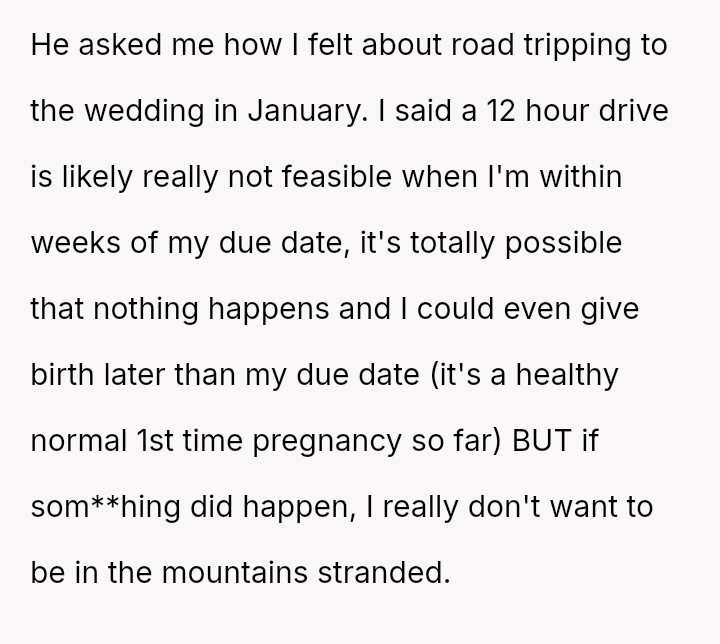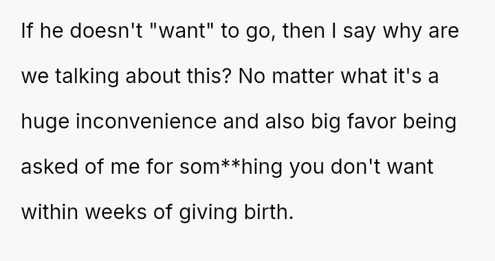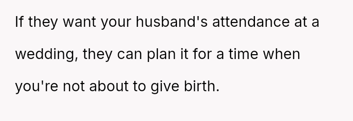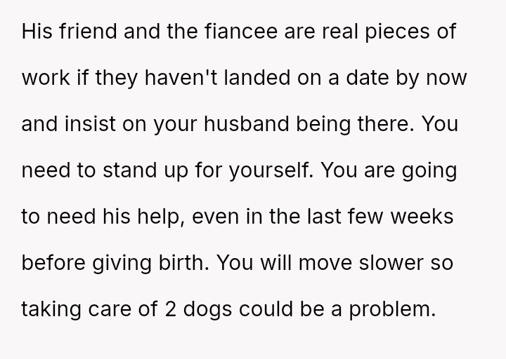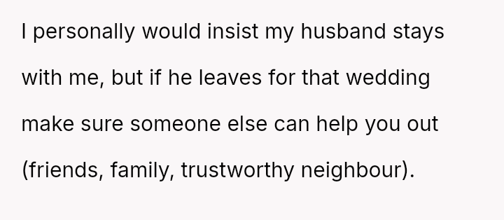 The original poster is facing a significant conflict between her husband's desire to attend his best friend's wedding and the practical, physical realities of being weeks away from a first-time delivery, compounded by feeling unsupported regarding the necessary childcare and travel logistics.