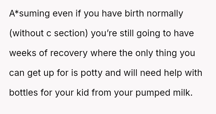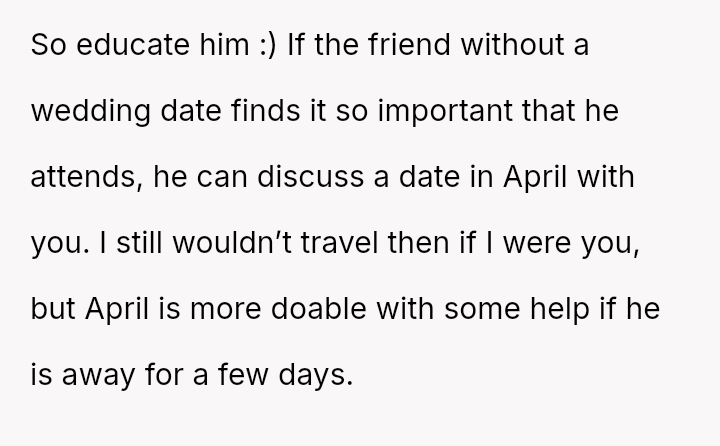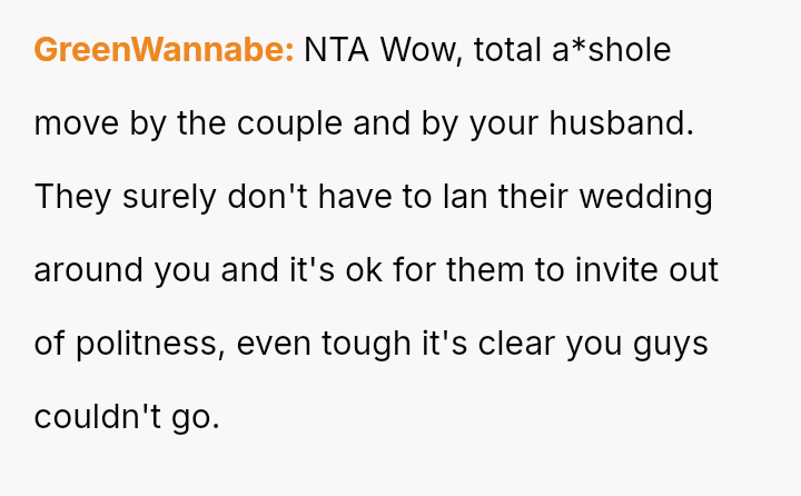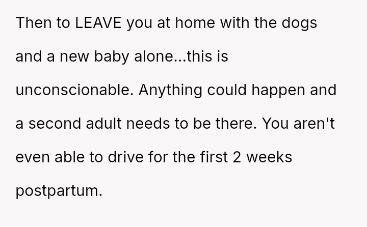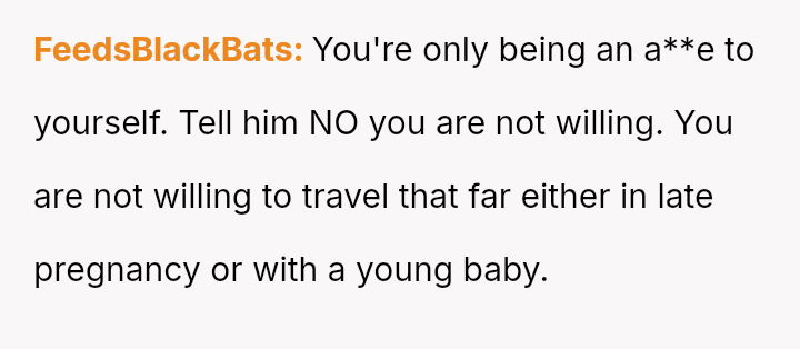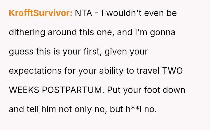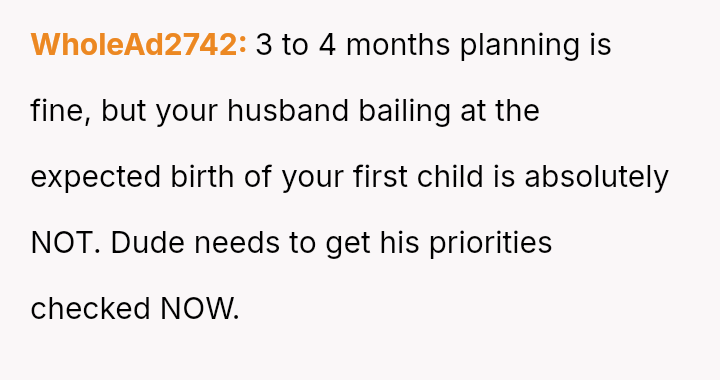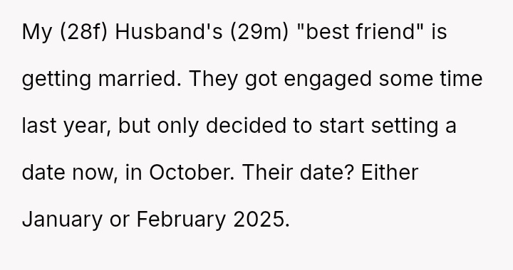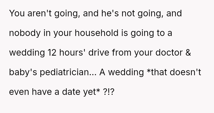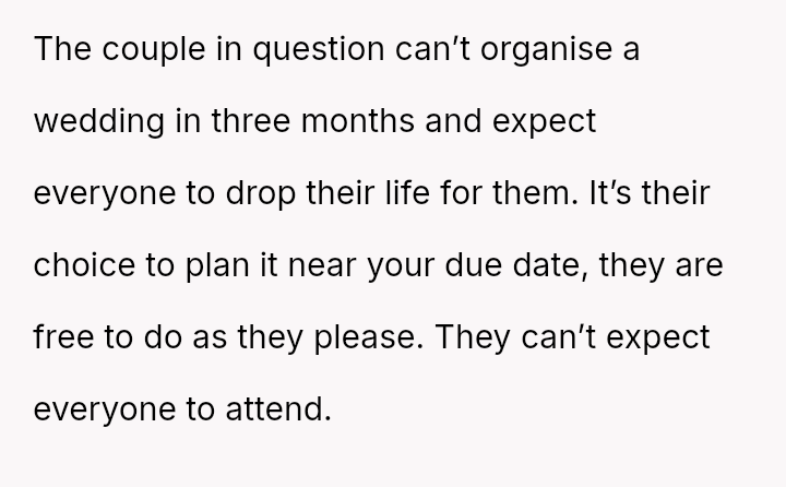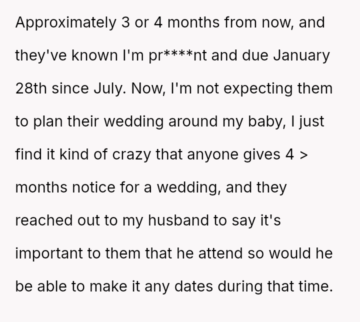 The original poster is facing a significant conflict between her husband's desire to attend his best friend's wedding and the practical, physical realities of being weeks away from a first-time delivery, compounded by feeling unsupported regarding the necessary childcare and travel logistics.