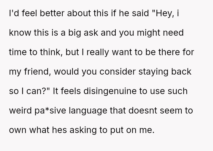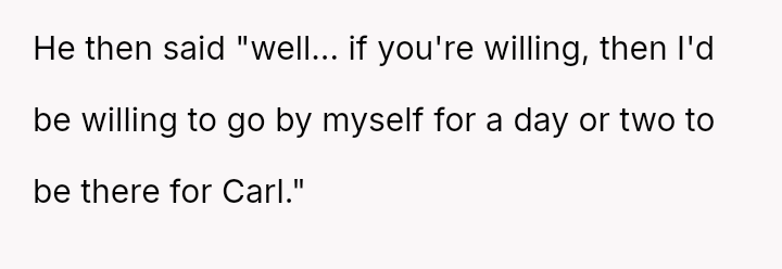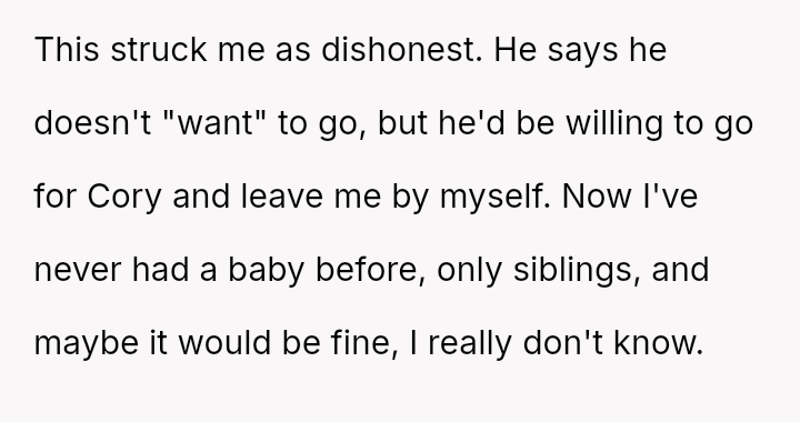 Her husband's pa*sive communication style, suggesting he would go alone while framing it as a concession, has heightened her feelings of being unvalued in this difficult transitional period.