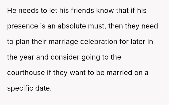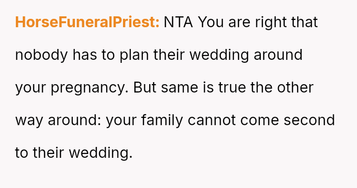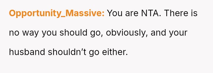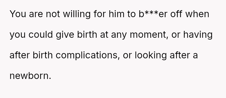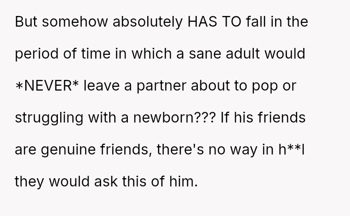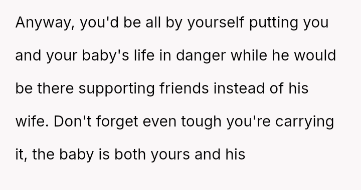 Given the near-term due date, the core question is whether the husband's commitment to his friend ethically overrides the pr****nt wife's need for security and primary support during her most vulnerable time, or if his willingness to attend alone, unsupported by his wife, necessitates a firm boundary based on the imminent birth?