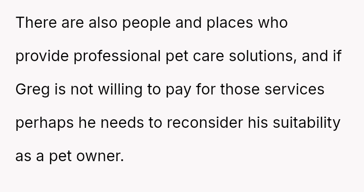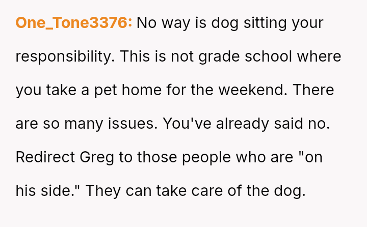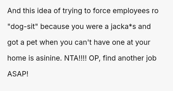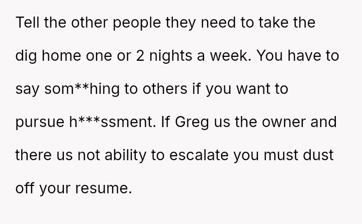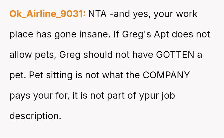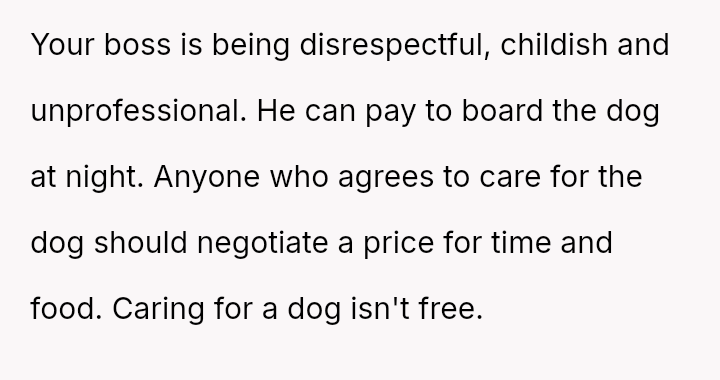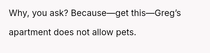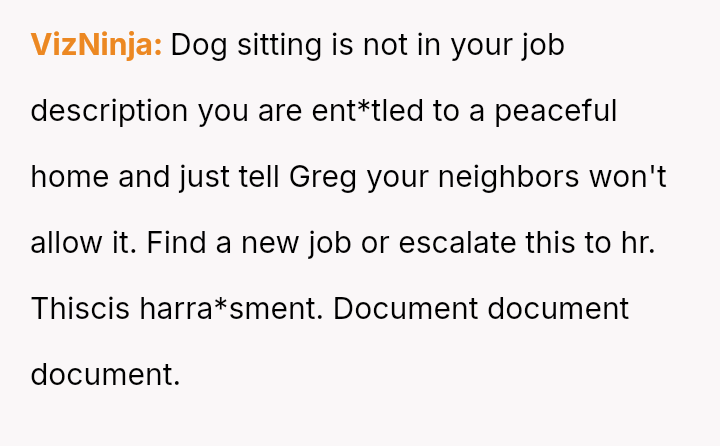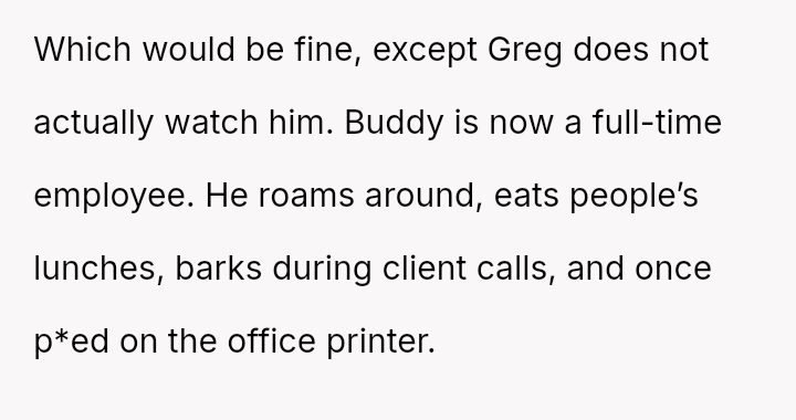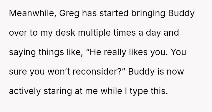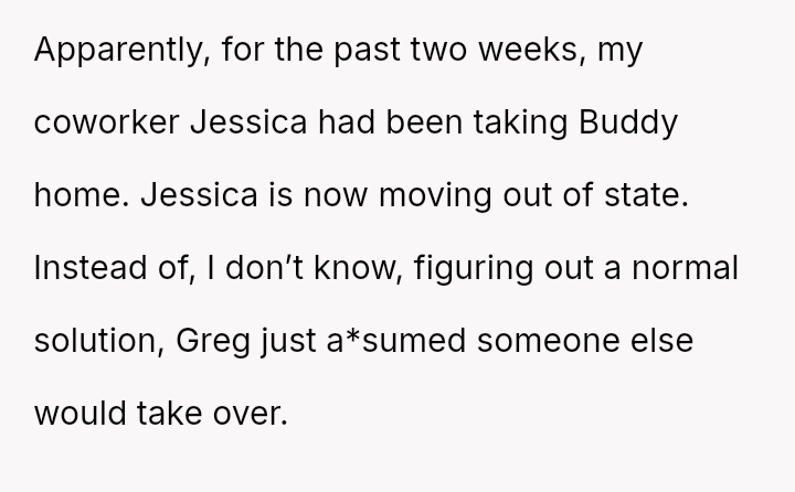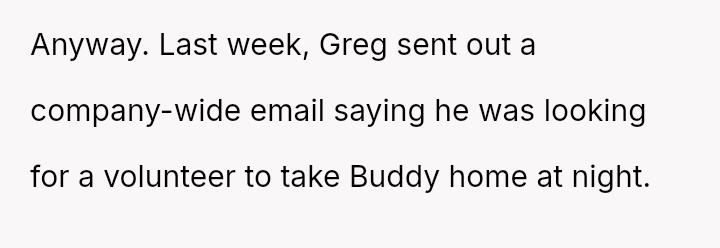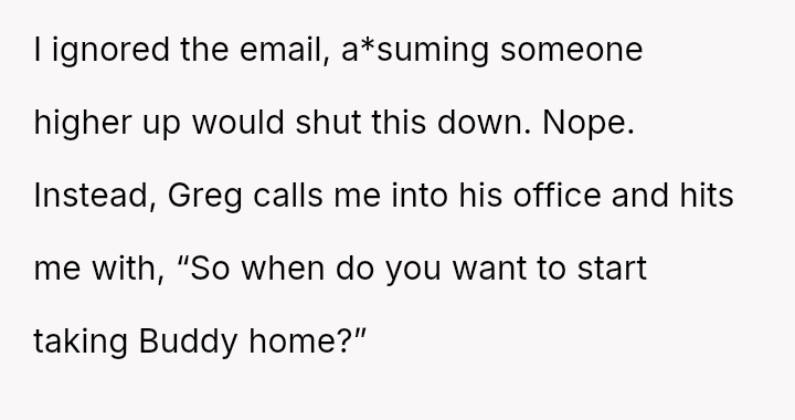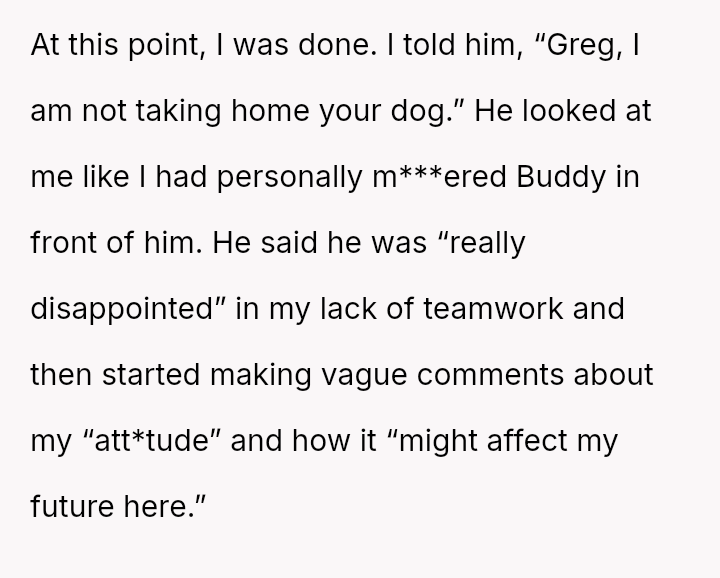 When Greg's apartment lease changed, he immediately expected an employee to take over caring for Buddy overnight, leading to the boss directly pressuring the narrator to comply, which she refused, resulting in workplace tension and subtle threats to her job security.