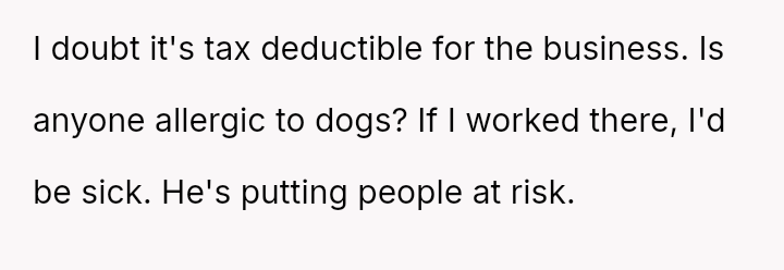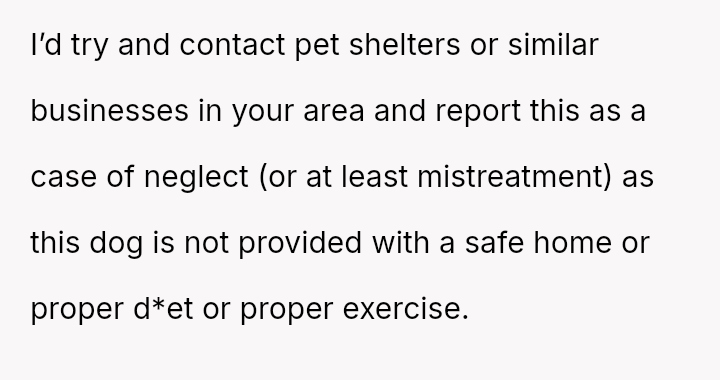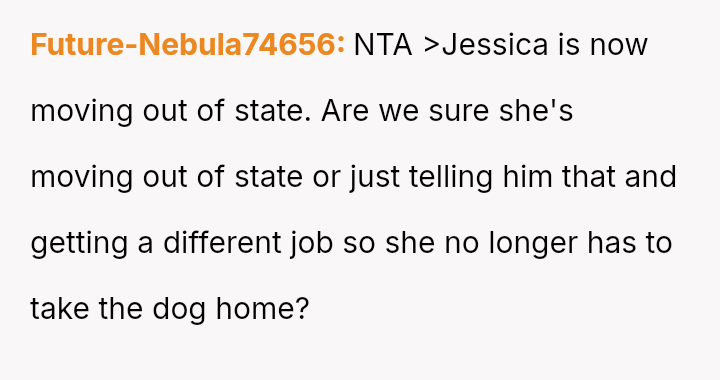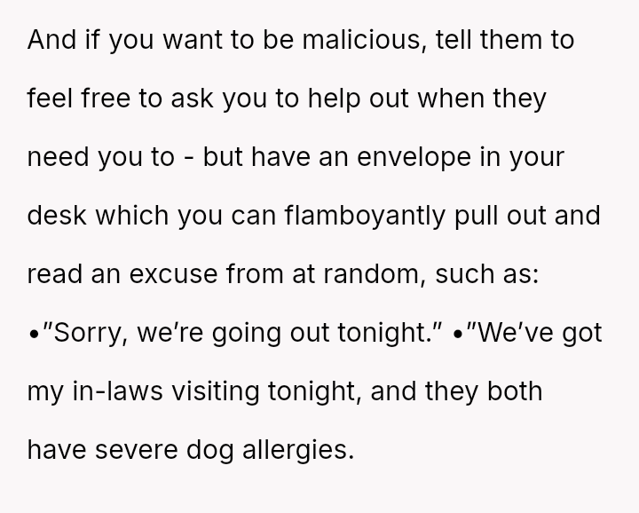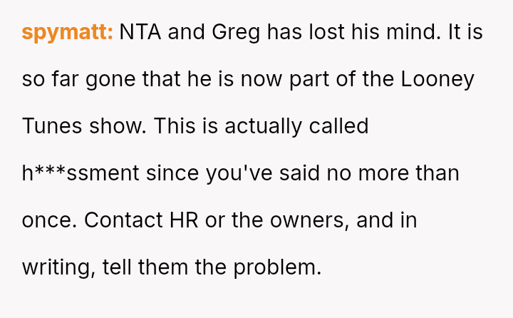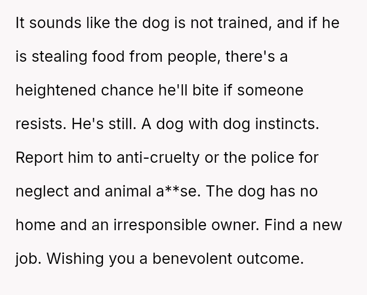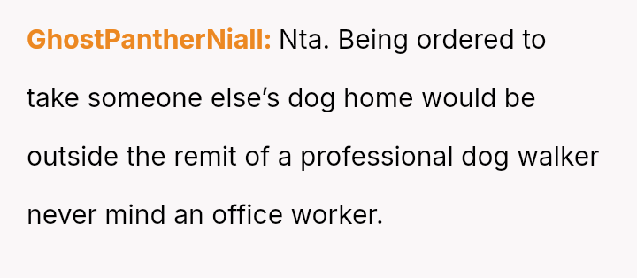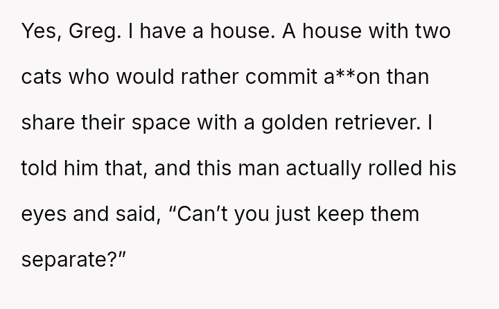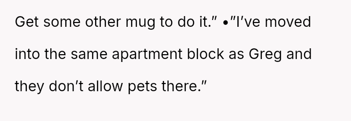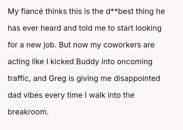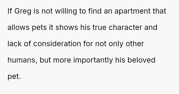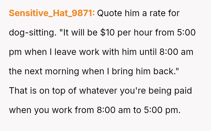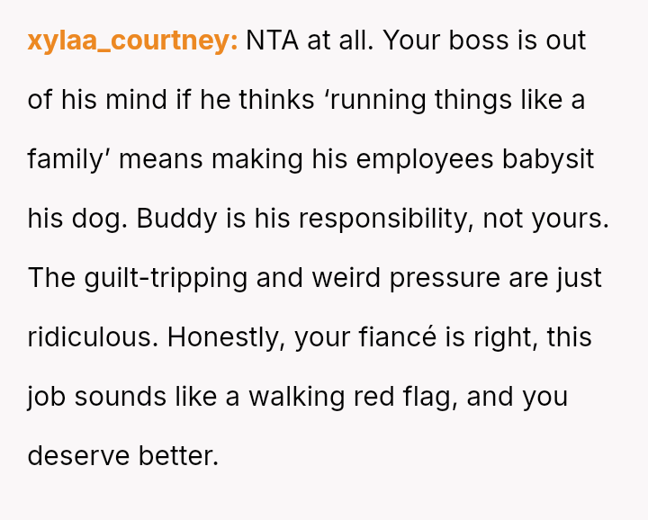 When Greg's apartment lease changed, he immediately expected an employee to take over caring for Buddy overnight, leading to the boss directly pressuring the narrator to comply, which she refused, resulting in workplace tension and subtle threats to her job security.