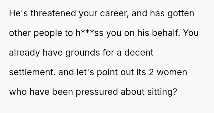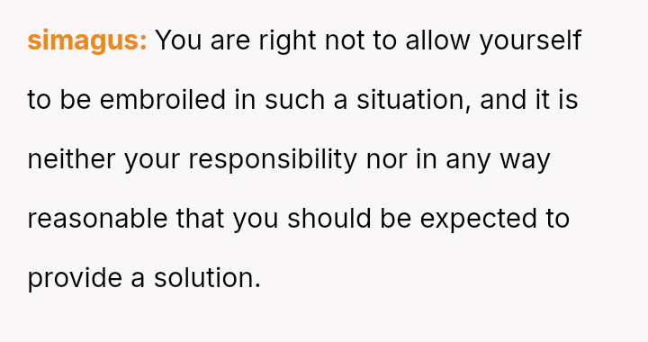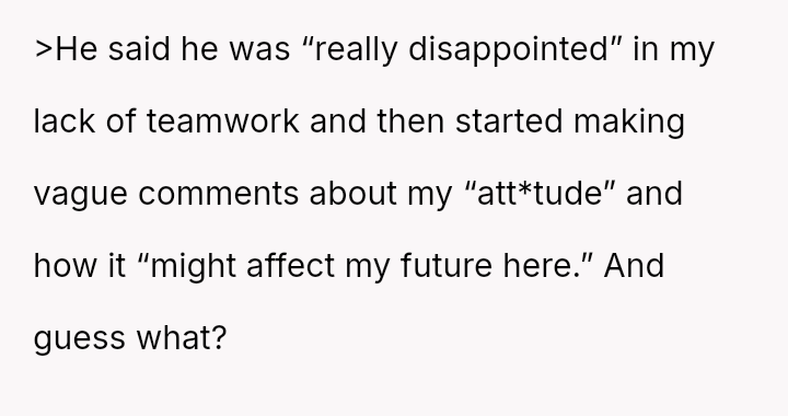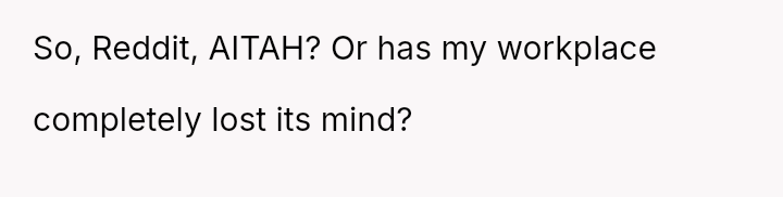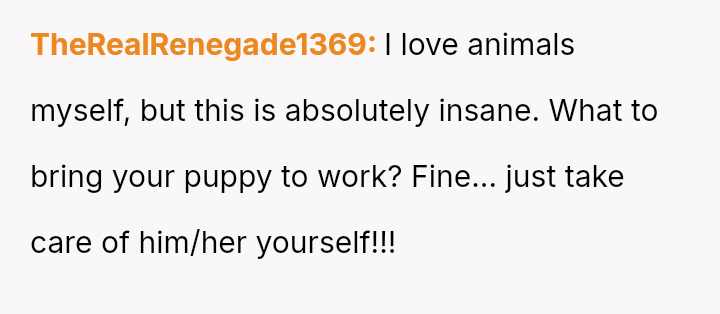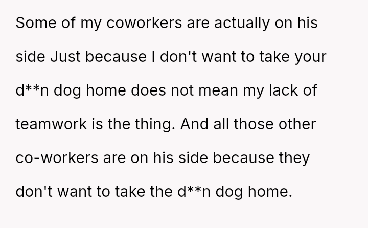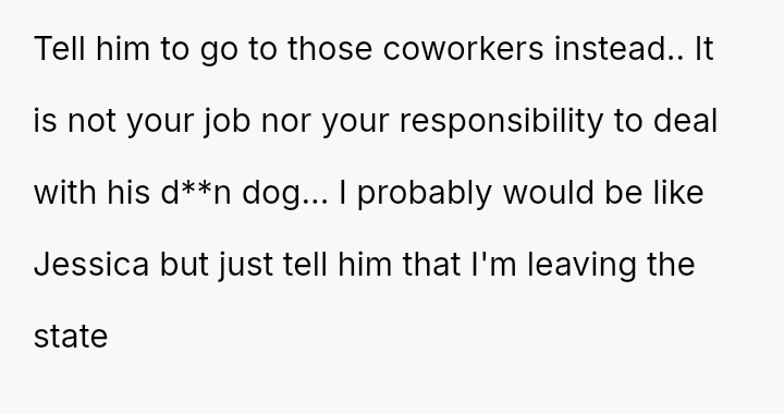 The narrator finds herself in a difficult position where her reasonable boundary—refusing to take on the responsibility of her boss's pet—is being framed by management as a failure of teamwork and loyalty.